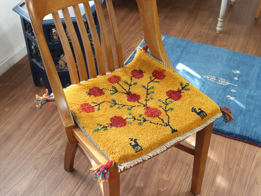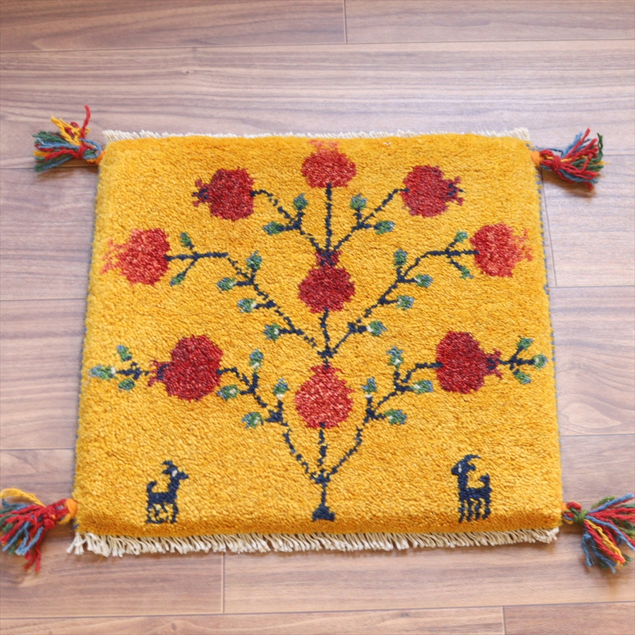 - ギャッベ イラン産手織り 座布団サイズ 40x43cm イエロー ザクロの実