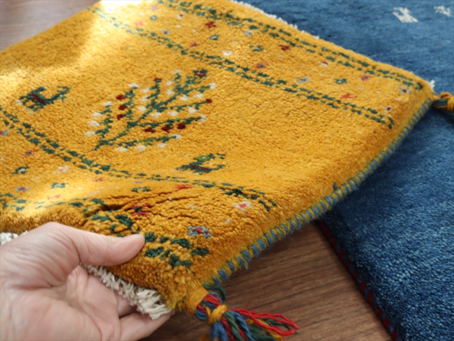 Key:ギャッベ ギャベ Gabbeh, イラン, 遊牧民, 手織り, 手紡ぎ, ペルシャ, 手織り絨毯, 部族絨毯, トライバルラグ, ミニギャッベ, オレンジ, イエロー, 黄色, ポンポン, 1点もの, 現品販売, ウール100%, ミニギャベ, Gabbeh, Iran Persian rug, Hand Knotted, ガラタバザール