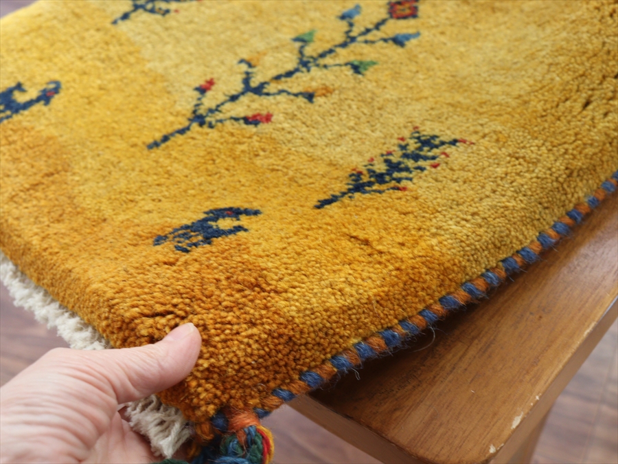 ギャッベ イラン産手織り 座布団サイズ 38x41cm イエローオレンジ 草花と動物