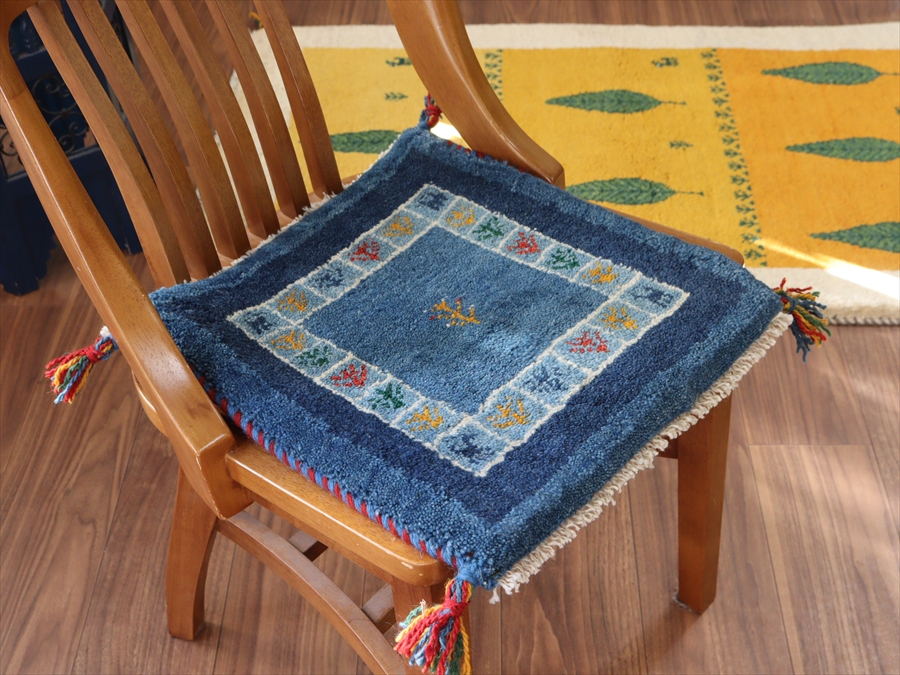 - ギャッベ イラン産手織り 座布団サイズ 43x41cm ブルー タイル 動物と草花