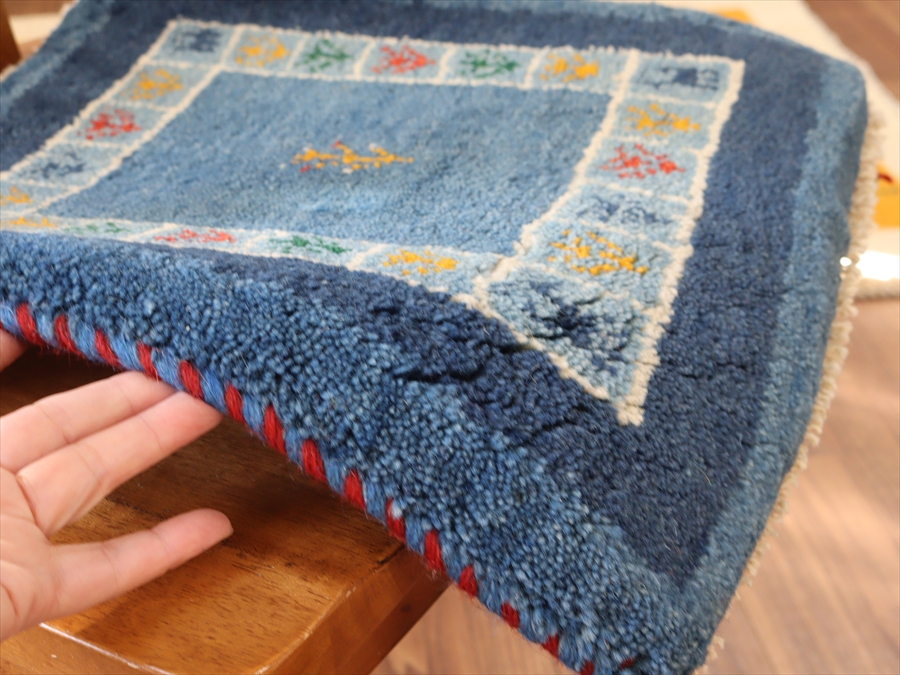 ギャッベ イラン産手織り 座布団サイズ 43x41cm ブルー タイル 動物と草花