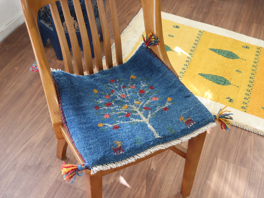 - ギャッベ イラン産手織り 座布団サイズ 39x45cm ブルー 花をつけた生命の木