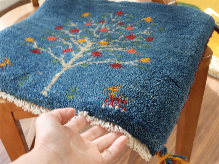 ギャッベ イラン産手織り 座布団サイズ 39x45cm ブルー 花をつけた生命の木
