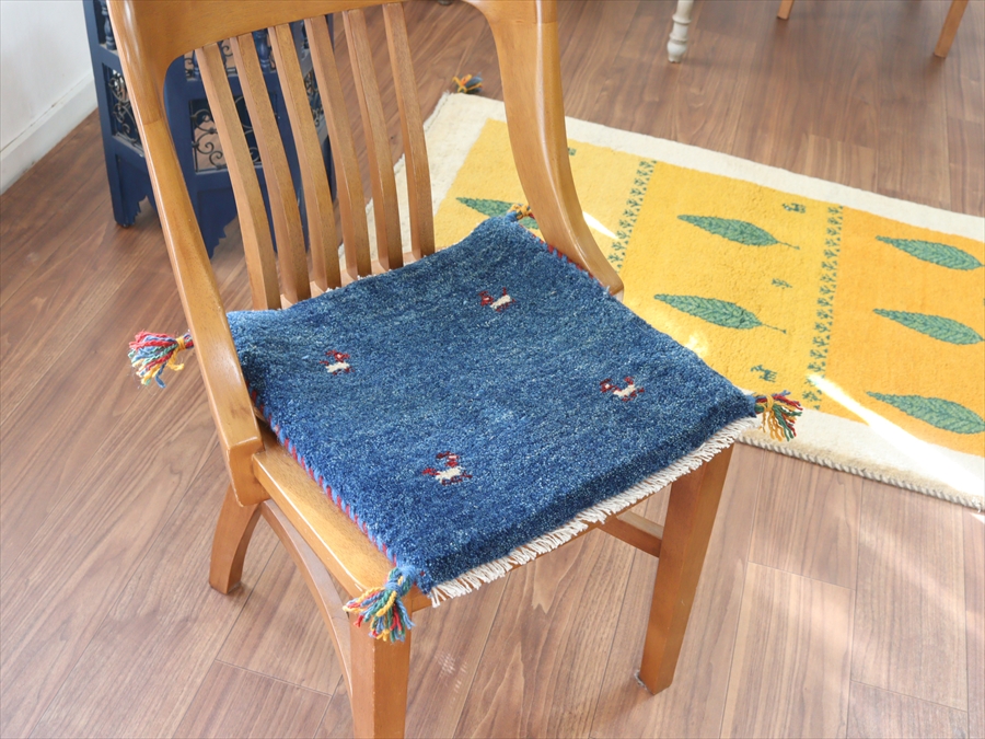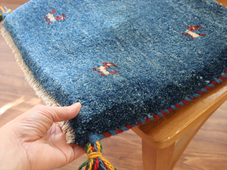 ギャッベ イラン産手織り 座布団サイズ 40x41cm ブルー 無地 シンプル