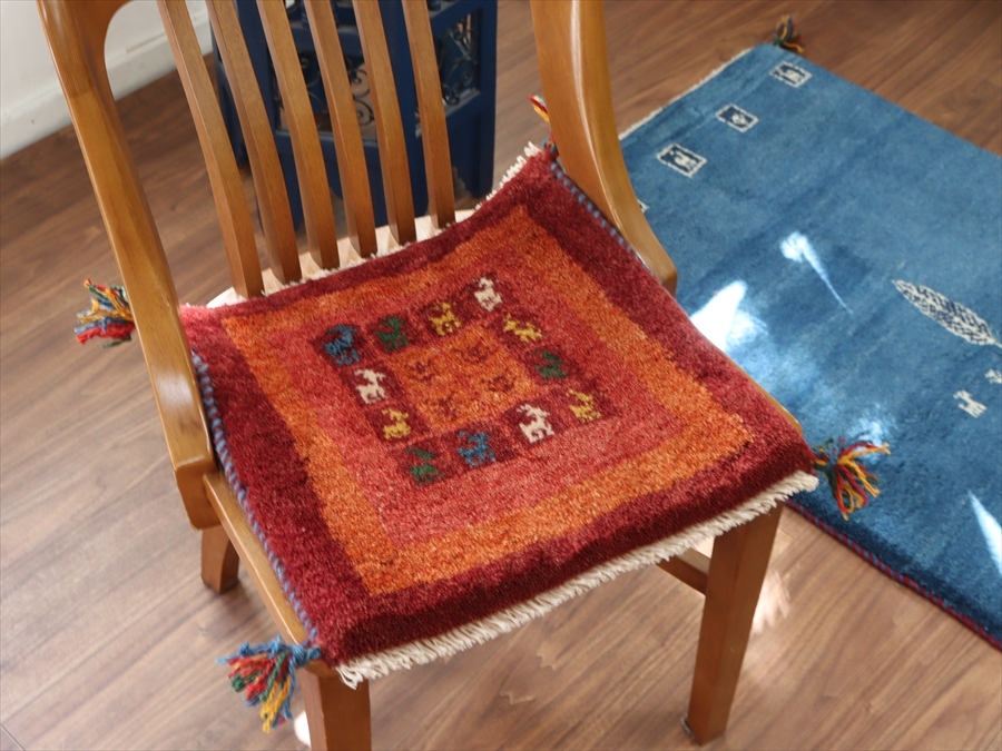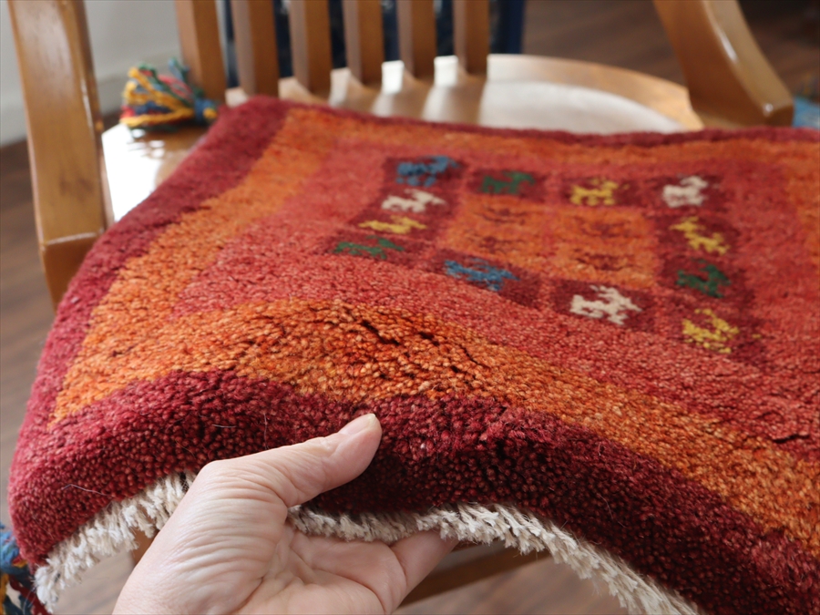 ギャッベ イラン産手織り 座布団サイズ 40x43cm レッド サーモンオレンジ カラフル動物モチーフ
