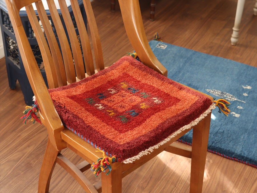何枚も集めたくなる、40cm角の座布団サイズギャベ。四隅に大きなポンポンのついた、伝統的なスタイルでおられています。フローリングに並べて座布団がわりに使ったり、ベンチやダイニングチェアの座面など、使い方はいろいろ。壁にタペストリーのように飾るのもおすすめです。
