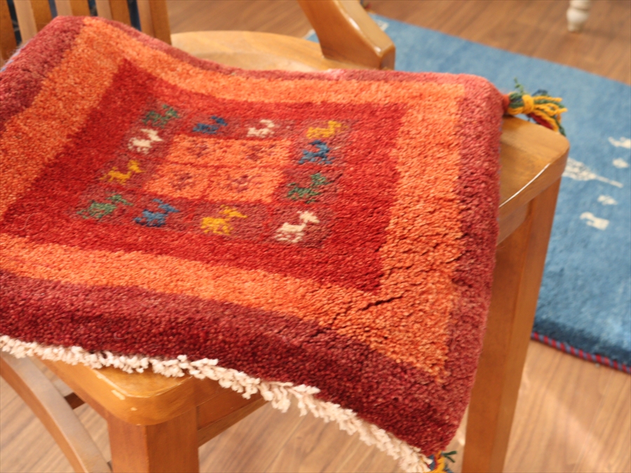 ギャッベ イラン産手織り 座布団サイズ 39x41cm レッド サーモンオレンジ カラフル動物モチーフ