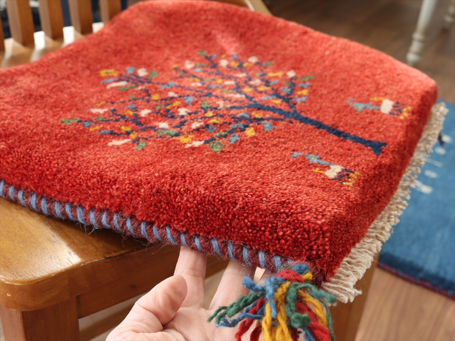 - ギャッベ イラン産手織り 座布団サイズ 41x43cm レッド 花をつけた生命の木