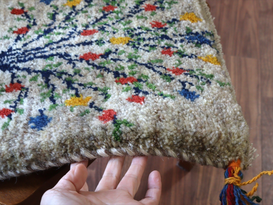- ギャッベ イラン産手織り 座布団サイズ 41x40cm グレー ベージュ 花をつけた生命の木