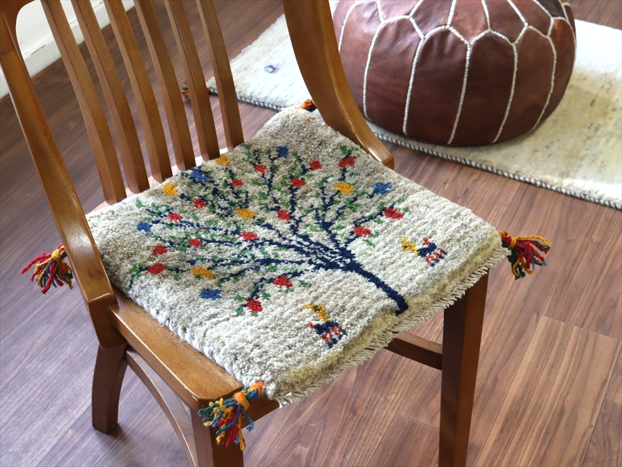 ギャッベ イラン産手織り 座布団サイズ 41x40cm グレー ベージュ 花をつけた生命の木