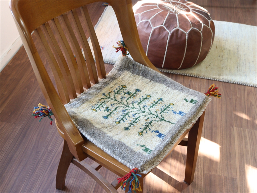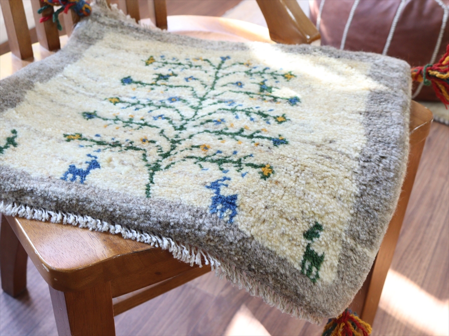 ギャッベ イラン産手織り 座布団サイズ 37x43cm グレー ベージュ 生命の木