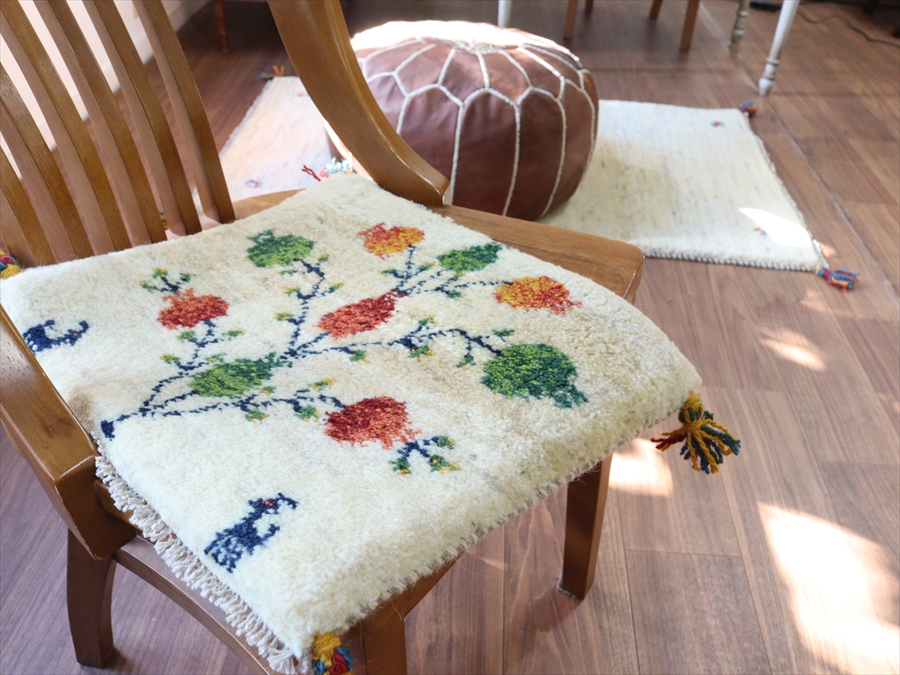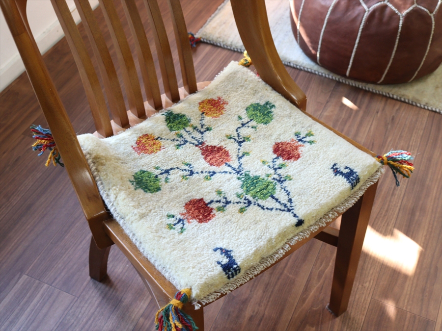 ギャッベ イラン産手織り 座布団サイズ 37x41cm ザクロの実 ナチュラルアイボリー