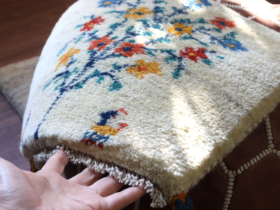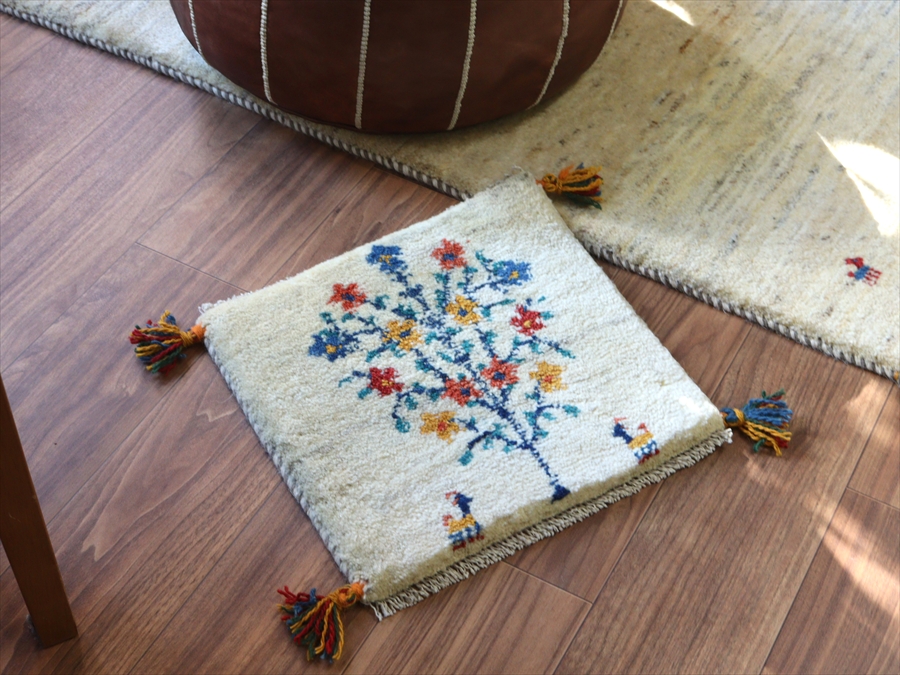 - ギャッベ イラン産手織り 座布団サイズ 38x40cm ナチュラルアイボリー 花をつけた生命の木