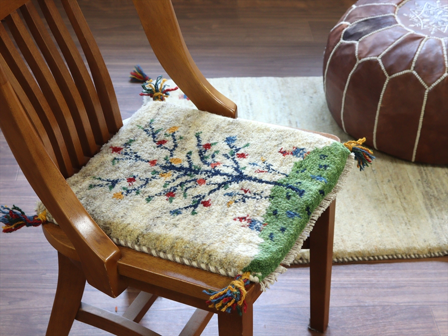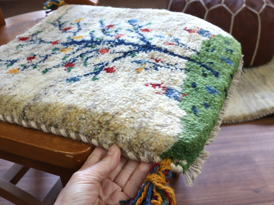 - ギャッベ イラン産手織り 座布団サイズ 40x39cm ナチュラルアイボリー 花をつけた生命の木