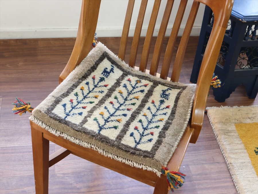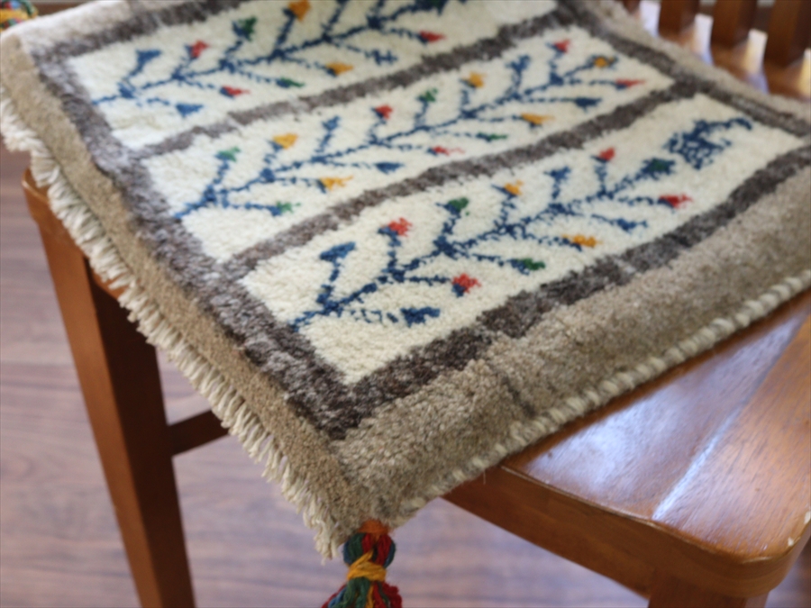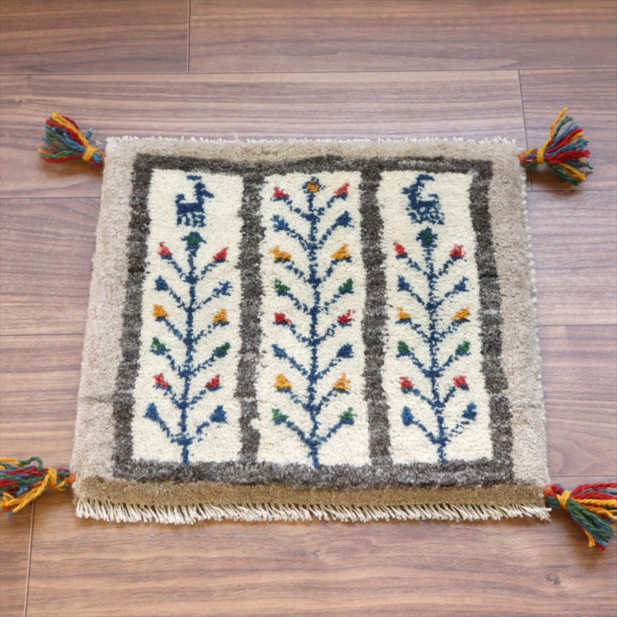 ギャッベ イラン産手織り 座布団サイズ 38x42cm ナチュラルアイボリー グレー 生命の木