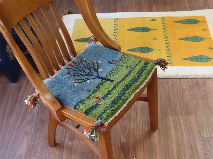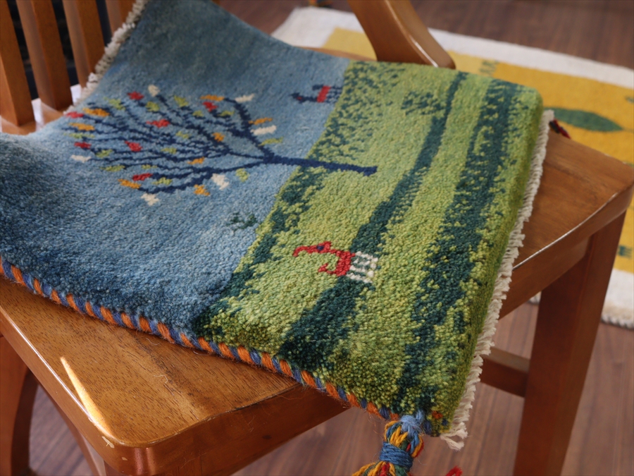 ギャッベ イラン産手織り 座布団サイズ 37x40cm ブルー&グリーン 花をつけた生命の木
