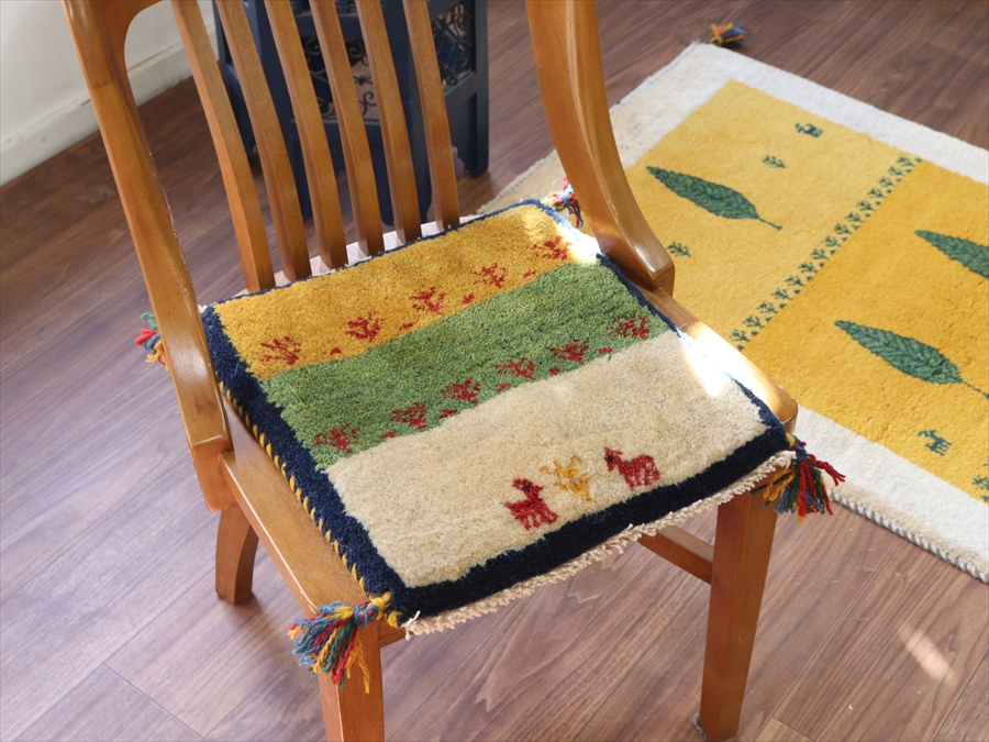 ギャッベ イラン産手織り 座布団サイズ 41x39cm イエロー グリーンアイボリー