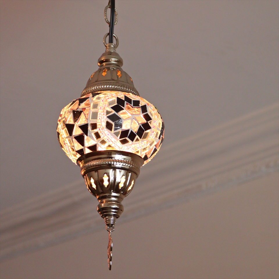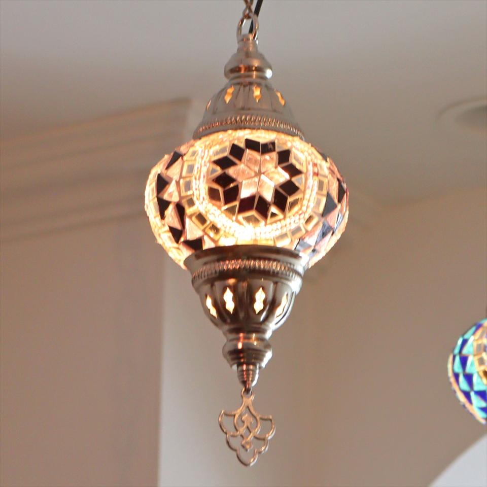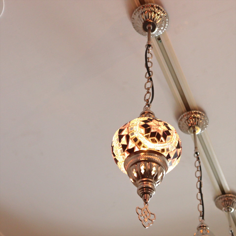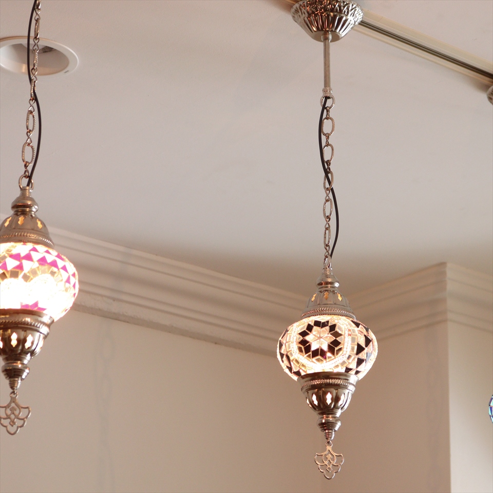 光沢のあるシルバーカラーの灯具と、トルコで手作りされたモザイクガラス球が使われたモザイクペンダントランプです。