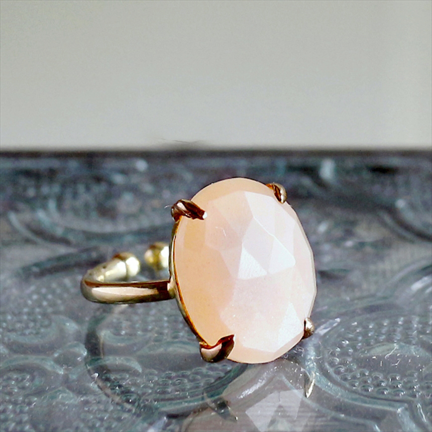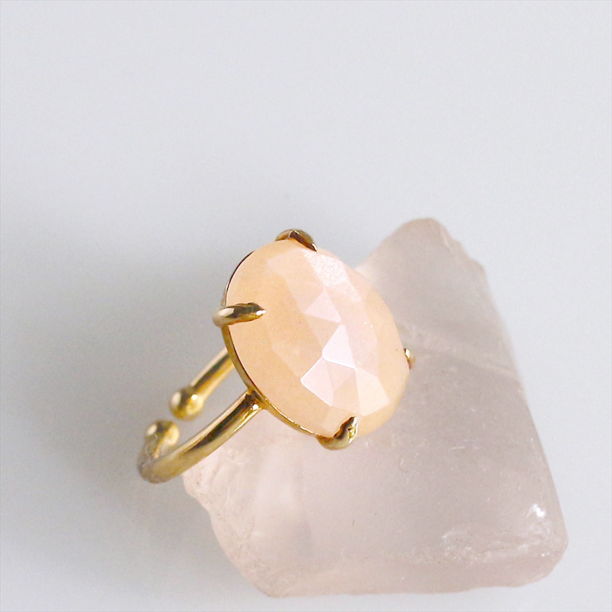 淡い桃色とオレンジが溶け合い、光を受けるたびにシラーと呼ばれる幻想的な光彩がゆらめくピーチムーンストーンのリングです。石の個性が際立つシンプルなデザインに仕上げました。裏面は光を透す仕様になっています。