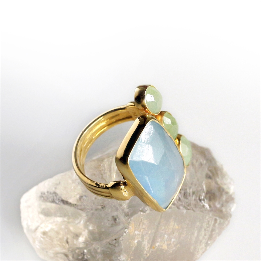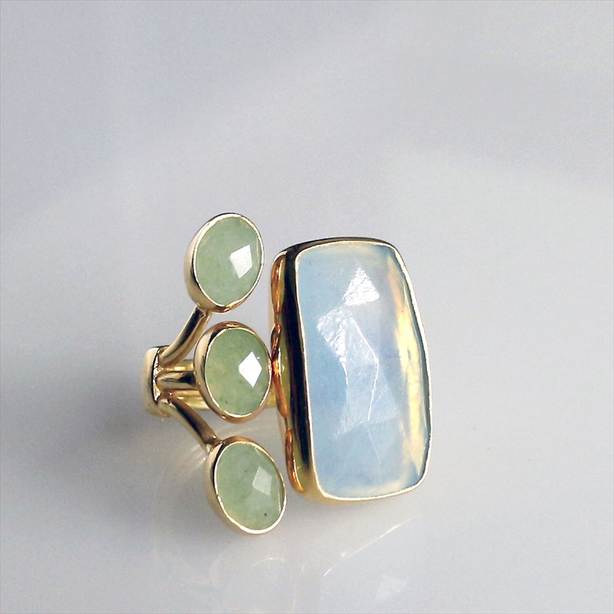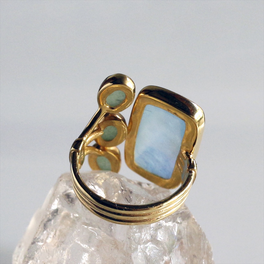 光を閉じ込めたような澄み切った淡いブルーのアクアマリンと、優しいグリーンのグリーンアベンチュリンの大変美しいリングです。大粒のアクアマリンにかわいらしいサイズのグリーンアベンチュリンが三つ寄り添うようについたデザイン。それぞれの石は裏面が抜けているので、光を透す仕様になっています。