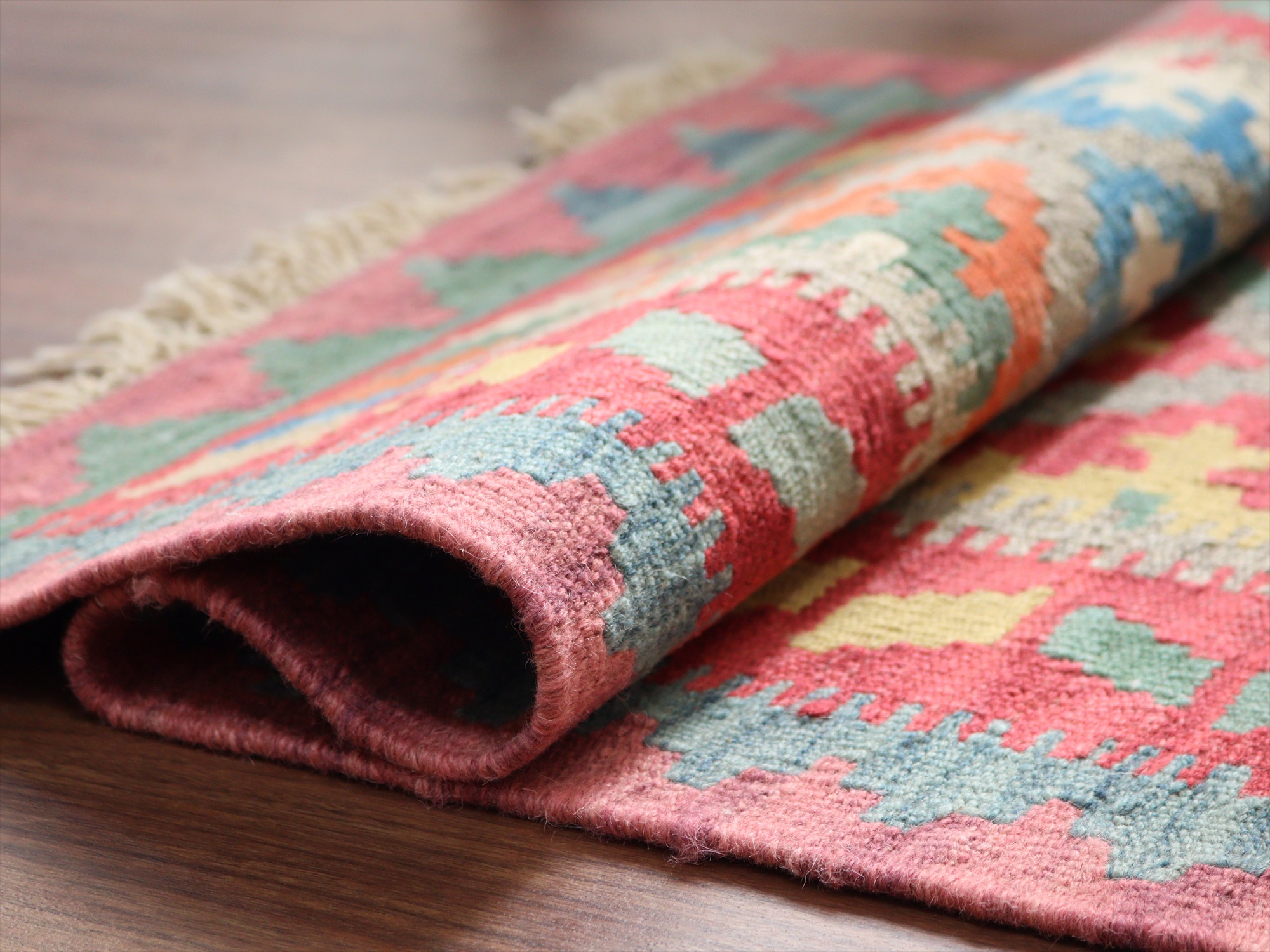 6-7mm程度の厚みがあり、パイル(毛足)がない平織りの敷物で表面は少しザラっとした肌ざわりです。織り手の自由なアイデアでデザインされていますので、左右対象でなかったり、モチーフが少しずれていたりということもありますが、世界で一枚だけの作品ですからその点はご了承ください。