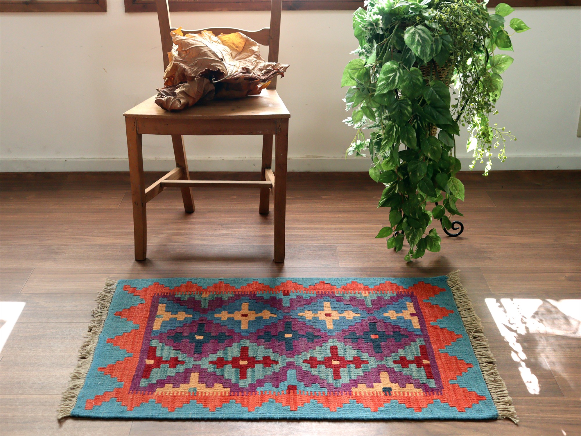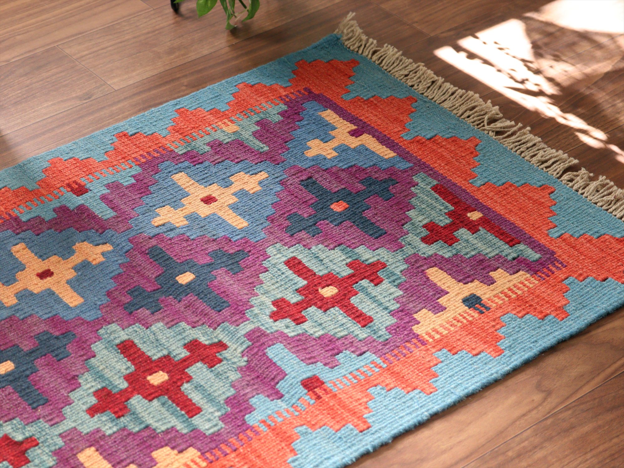 - 手織りキリム イラン シラーズ88×62cm カラフルな幾何学モチーフ