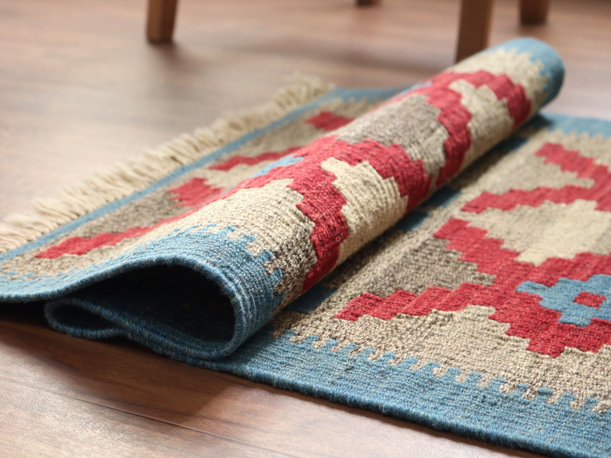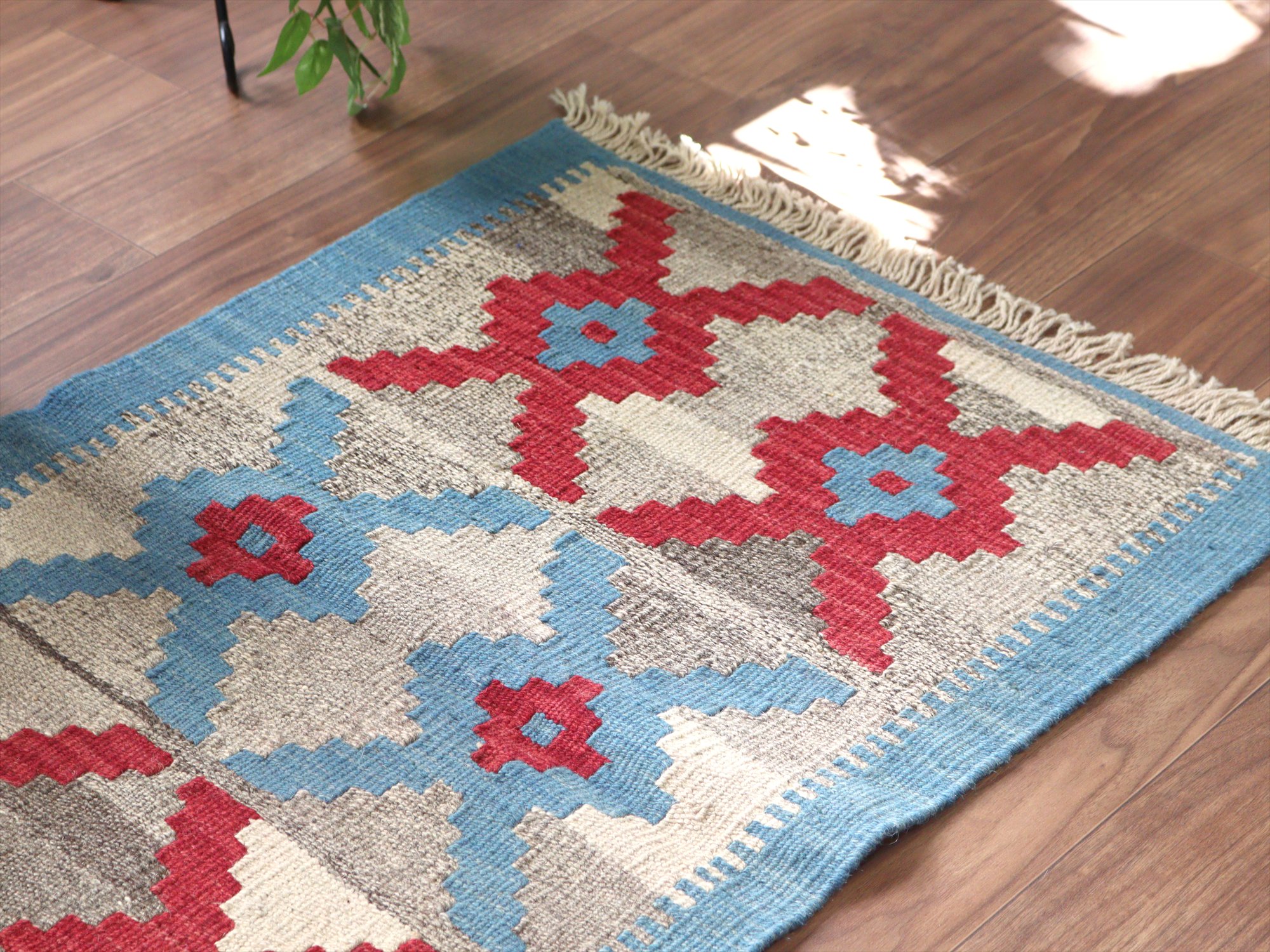 - 手織りキリム イラン シラーズ85×61cm カラフルな幾何学モチーフ