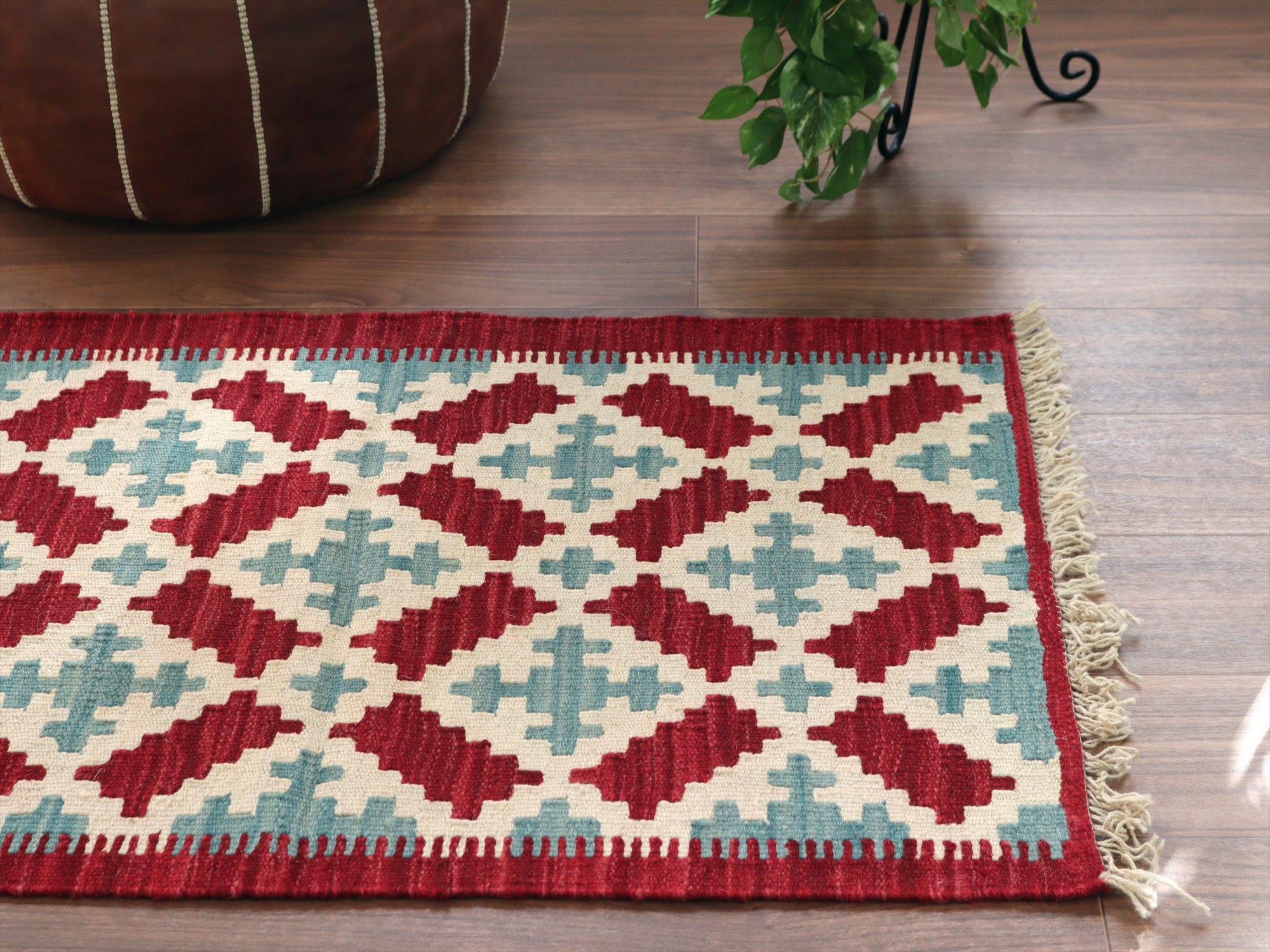 - 手織りキリム イラン シラーズ93×64cm カラフルな幾何学モチーフ