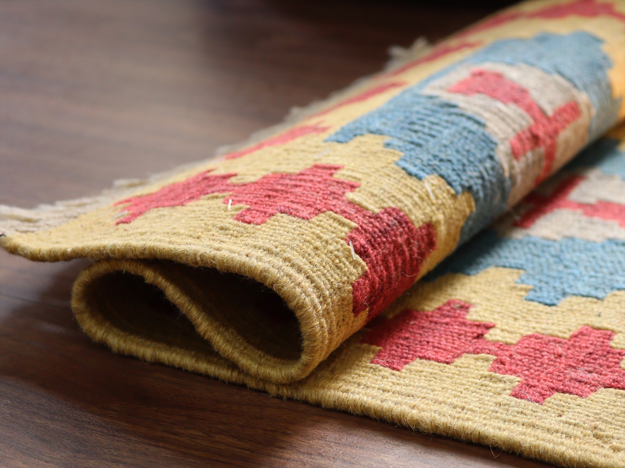 しっかりとしたハリのある織りで、厚みは4mm前後。多少カタチがゆがみがありますが、手織りキリムならではの味わいとご理解ください。