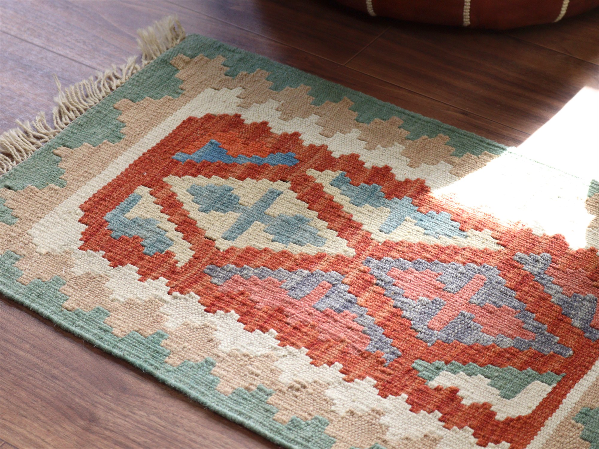 しっかりとしたハリのある織りで、厚みは4mm前後。多少カタチがゆがみがありますが、手織りキリムならではの味わいとご理解ください。