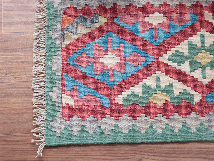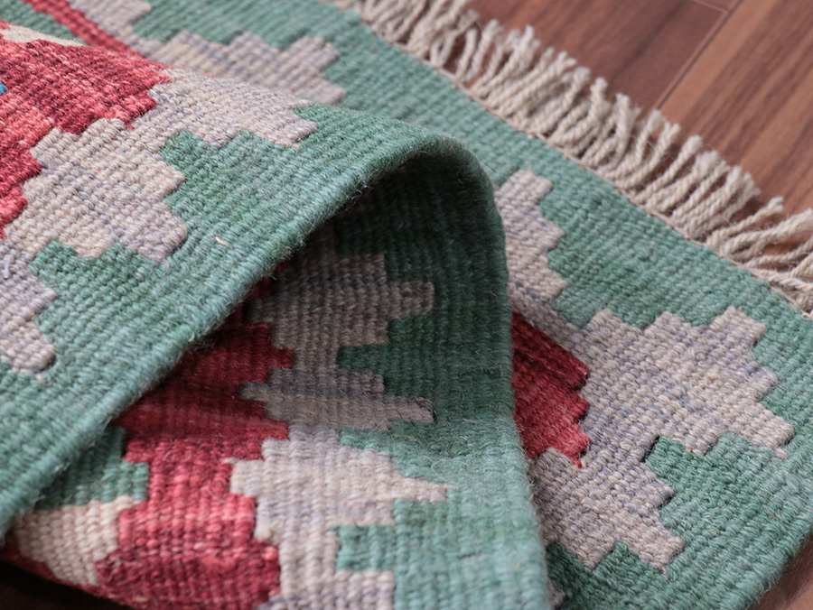 キリムはすべて手織りで作られています。織る女性の手の加減によって、サイズの多少の誤差やゆがみ等がありますことはご了承願います。
