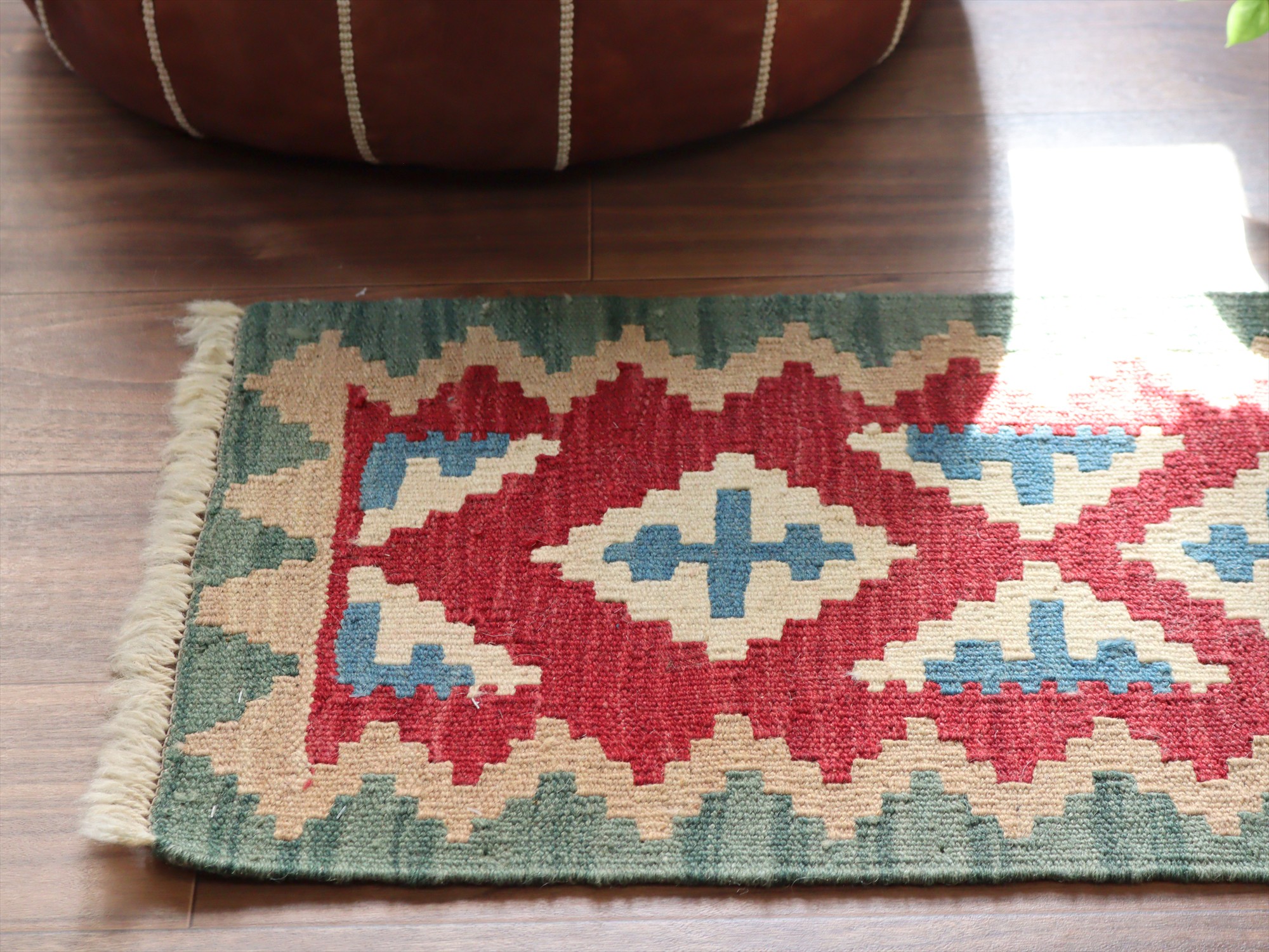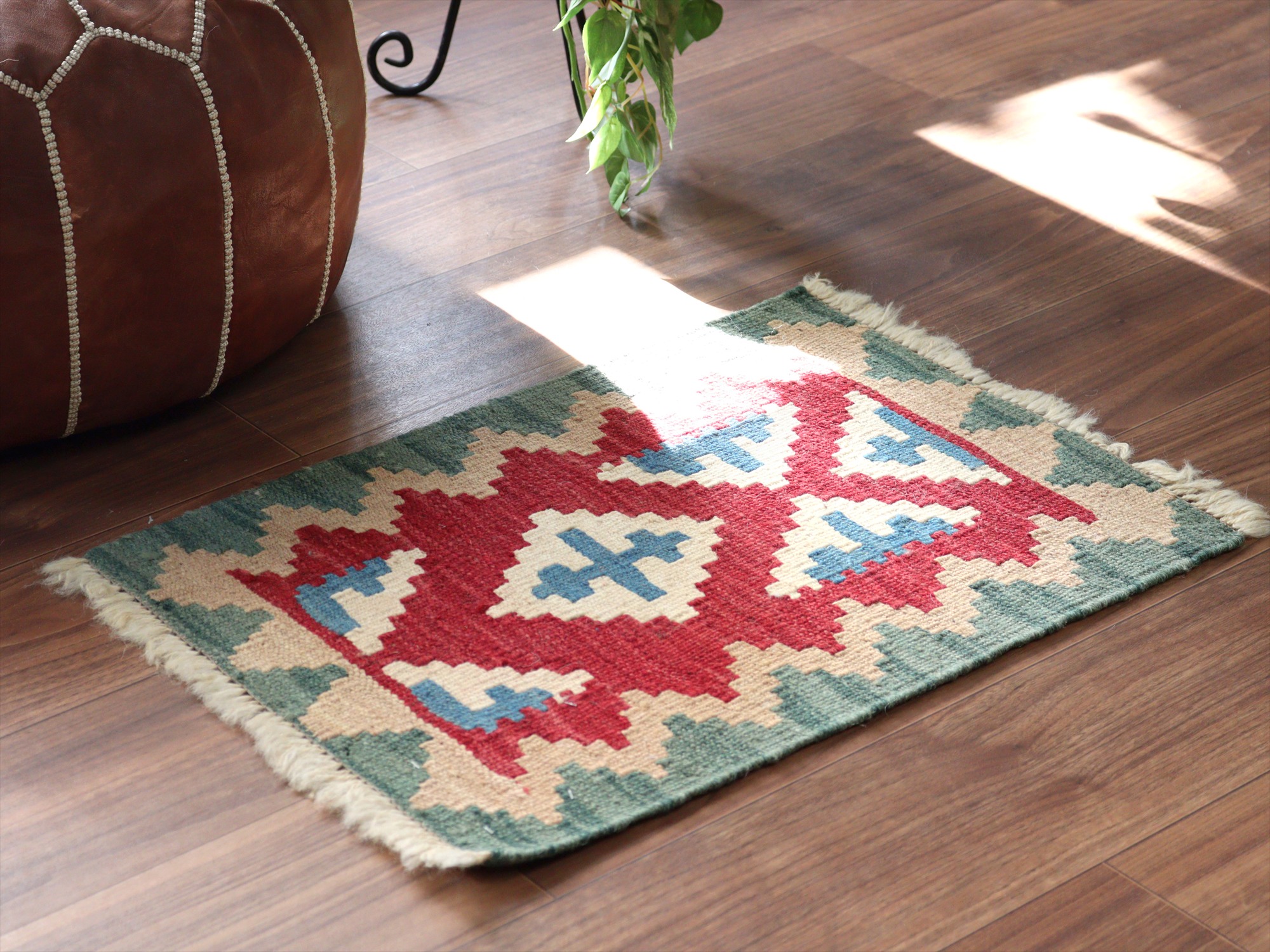 しっかりとしたハリのある織りで、厚みは4mm前後。多少カタチがゆがみがありますが、手織りキリムならではの味わいとご理解ください。