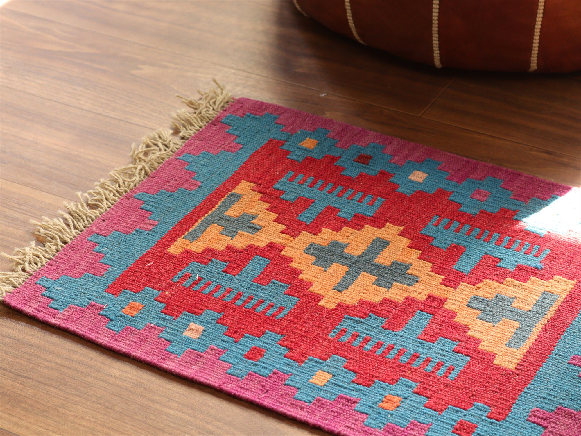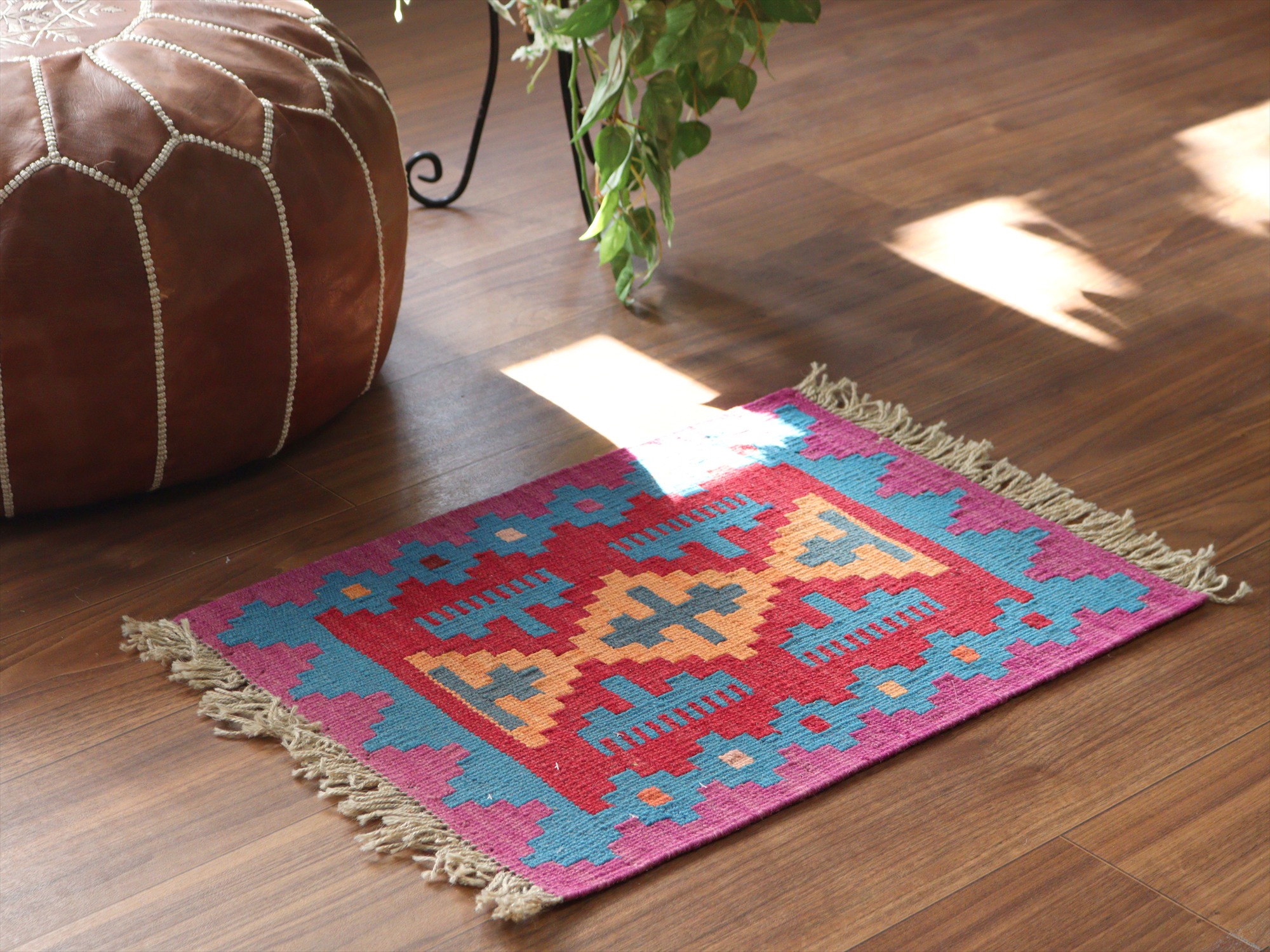 しっかりとしたハリのある織りで、厚みは4mm前後。多少カタチがゆがみがありますが、手織りキリムならではの味わいとご理解ください。