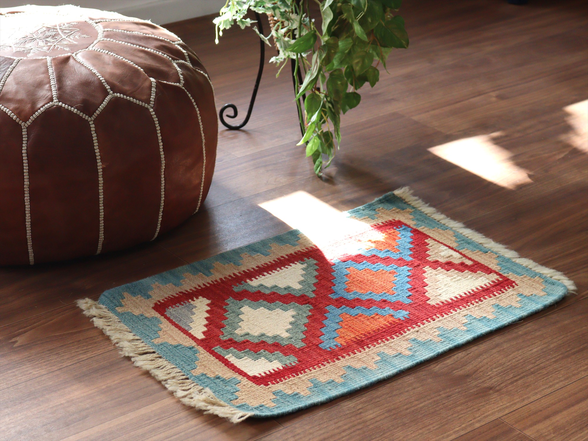 しっかりとしたハリのある織りで、厚みは4mm前後。多少カタチがゆがみがありますが、手織りキリムならではの味わいとご理解ください。