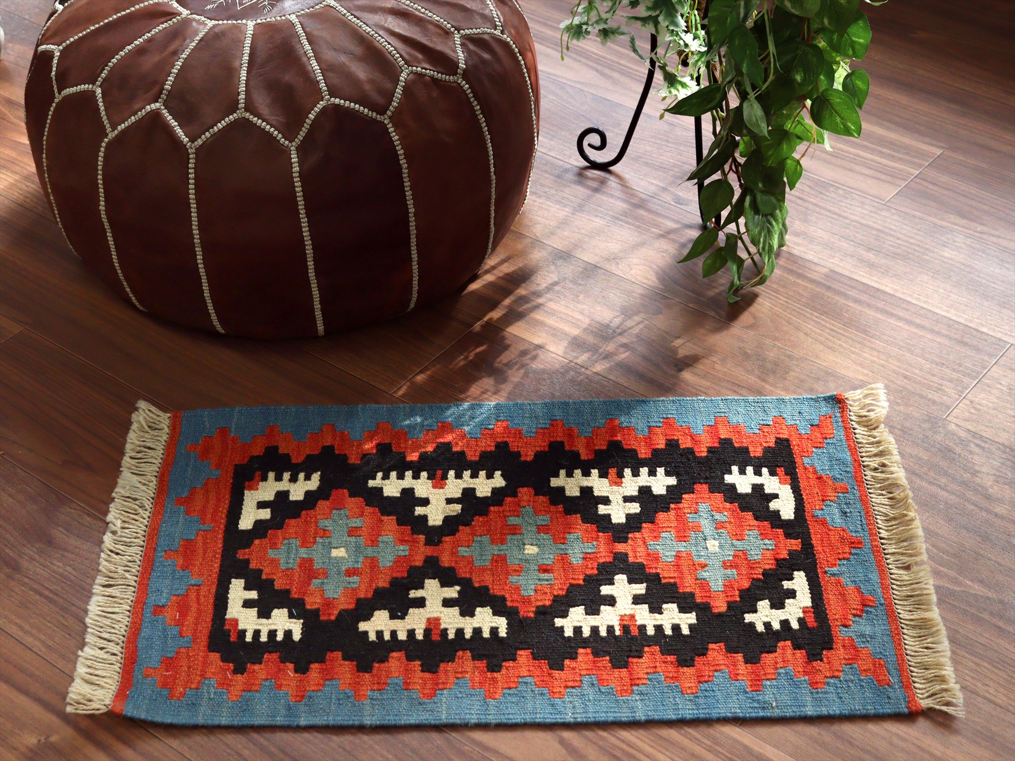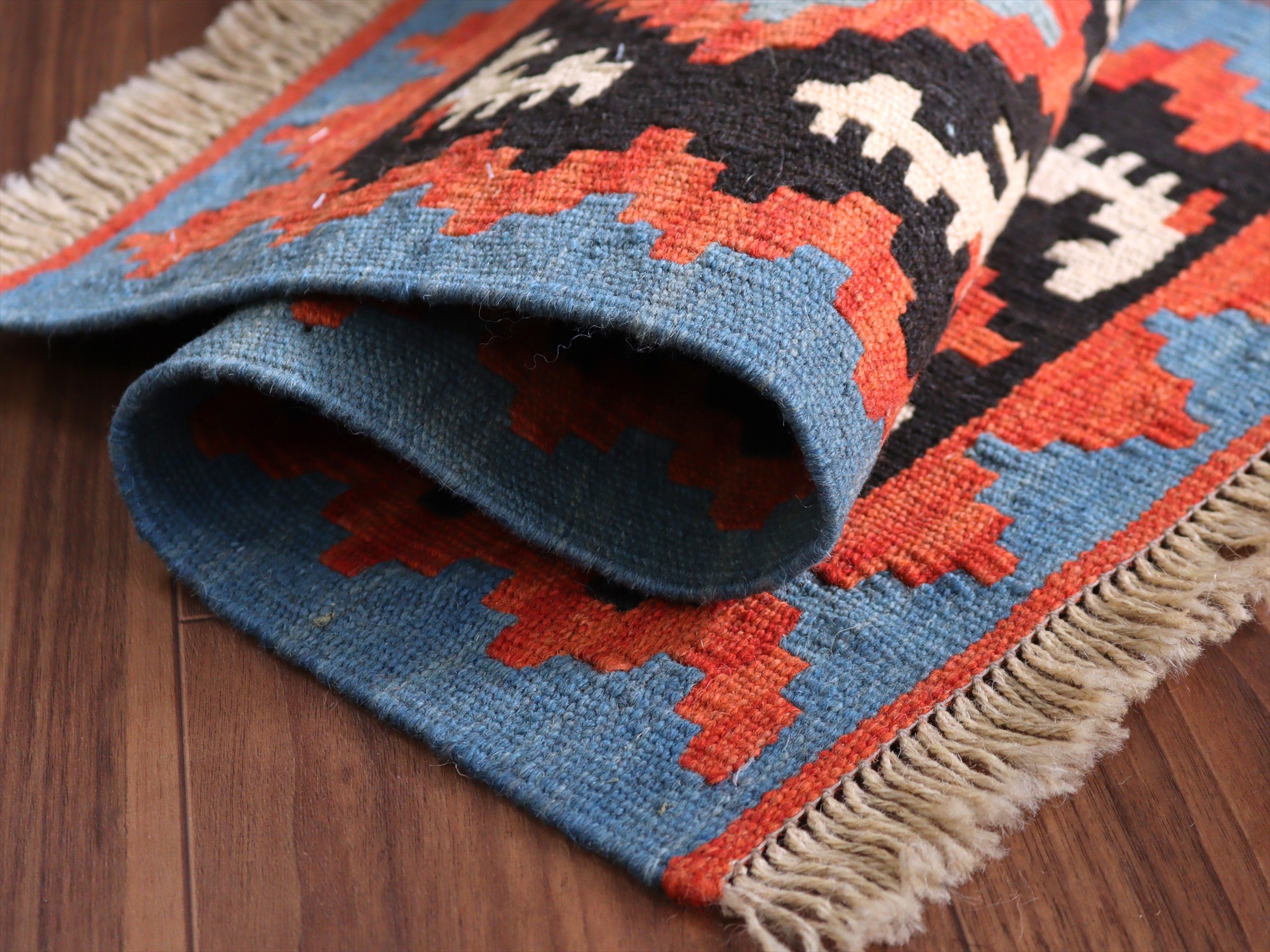 しっかりとしたハリのある織りで、厚みは4mm前後。多少カタチがゆがみがありますが、手織りキリムならではの味わいとご理解ください。