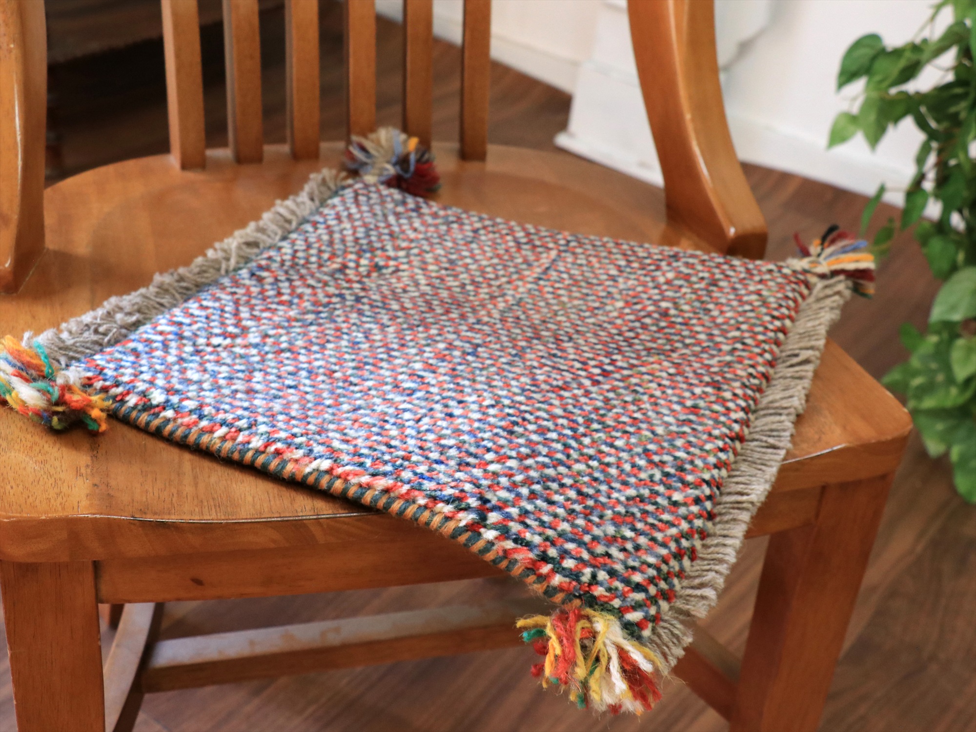 ふかふかした毛足(パイル)で、手触りが気持ちいい手織りのギャッベ。ミニサイズなので、座布団代わりに敷くのはもちろん、ダイニングチェアに敷いたり、絵画のように壁に貼ってデコレーションとしても楽しめます。手織りならではの一枚一枚違ったテイストをお楽しみください。