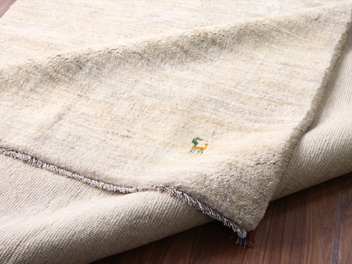 染めていない天然の羊毛の色をいかして織られたアイボリー色のギャッベです。シンプルなデザインながら、羊毛の色の濃淡が自然な感じに混ざり合っていて、ナチュラルであたたかみのある風合いに仕上がっています。
