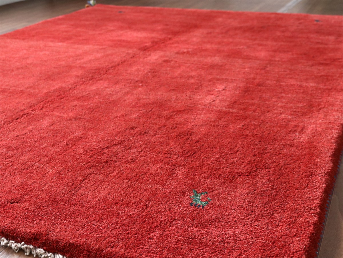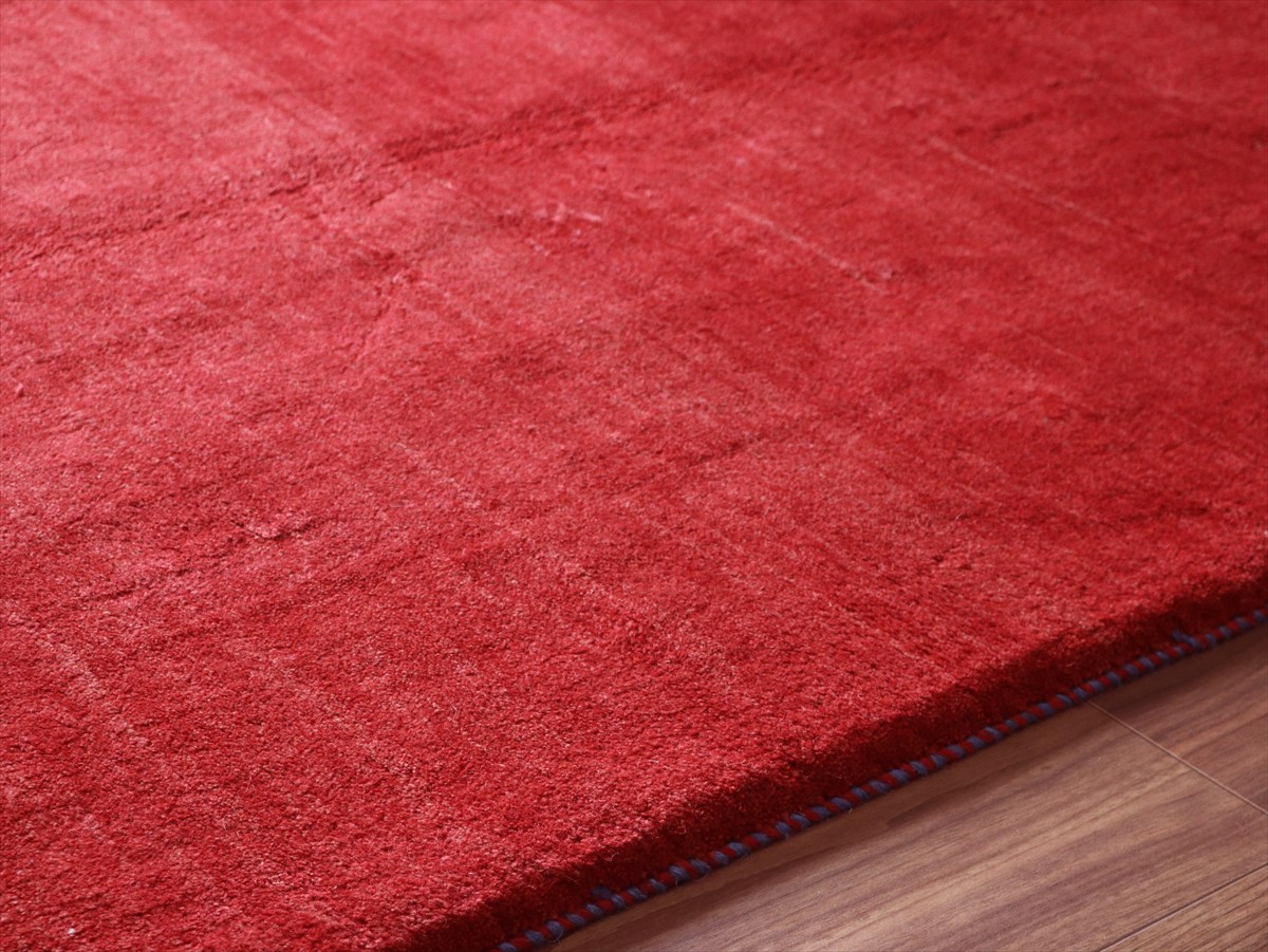 草木染めの染め色の濃淡を活かしたグラデーションがきれいな一枚。発色がよく、明るいイメージのレッドです。モチーフが四隅に入っているシンプルなデザインで、染めの濃淡による自然なグラデーションができています。明るいところで、パイル(毛足)の反対側からみると明るく見えます。