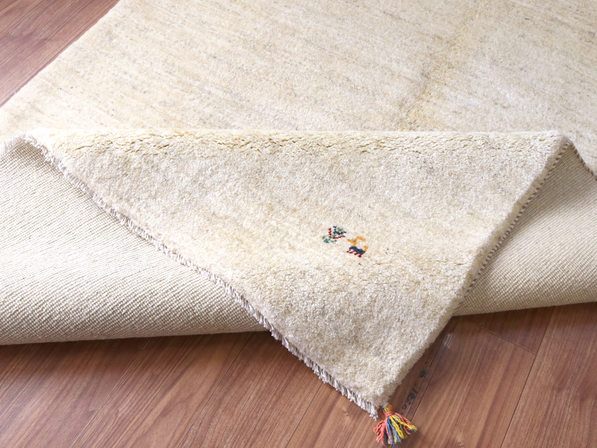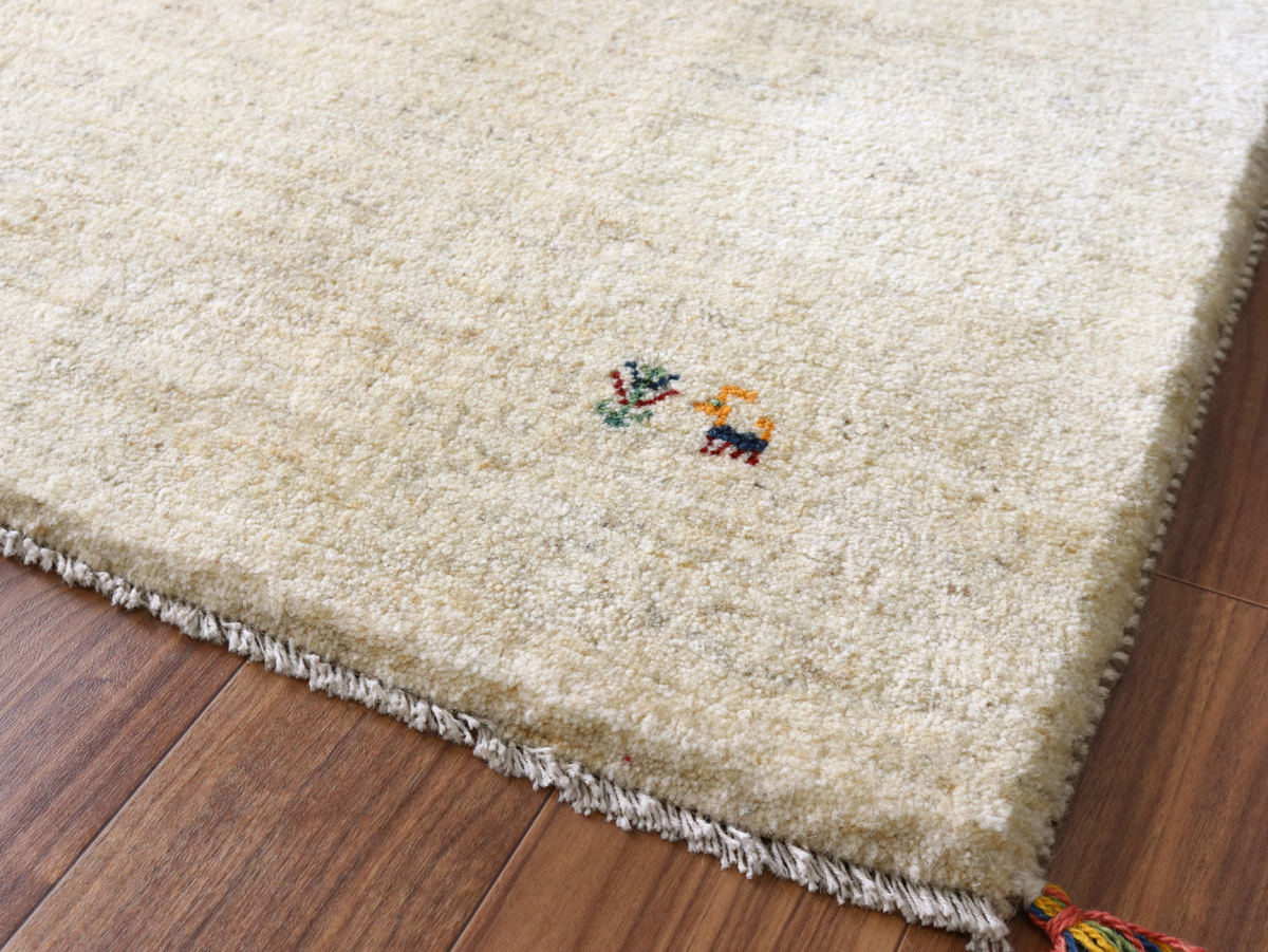 染めていない天然の羊毛の色をいかして織られたアイボリー色のギャッベです。シンプルなデザインながら、羊毛の色の濃淡が自然な感じに混ざり合っていて、ナチュラルであたたかみのある風合いに仕上がっています。