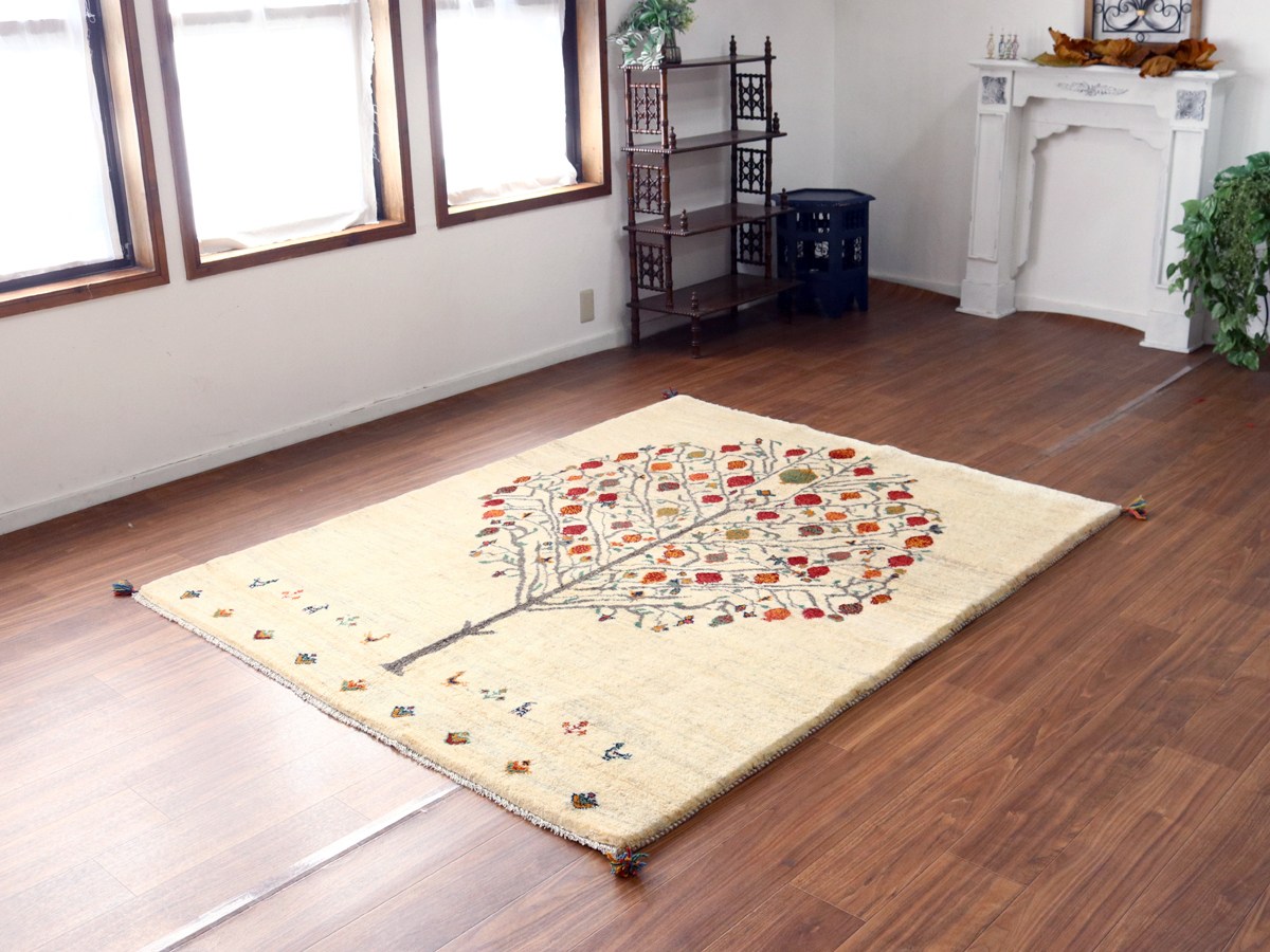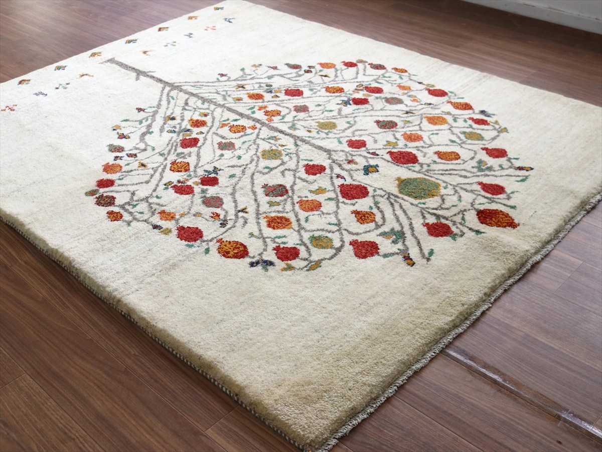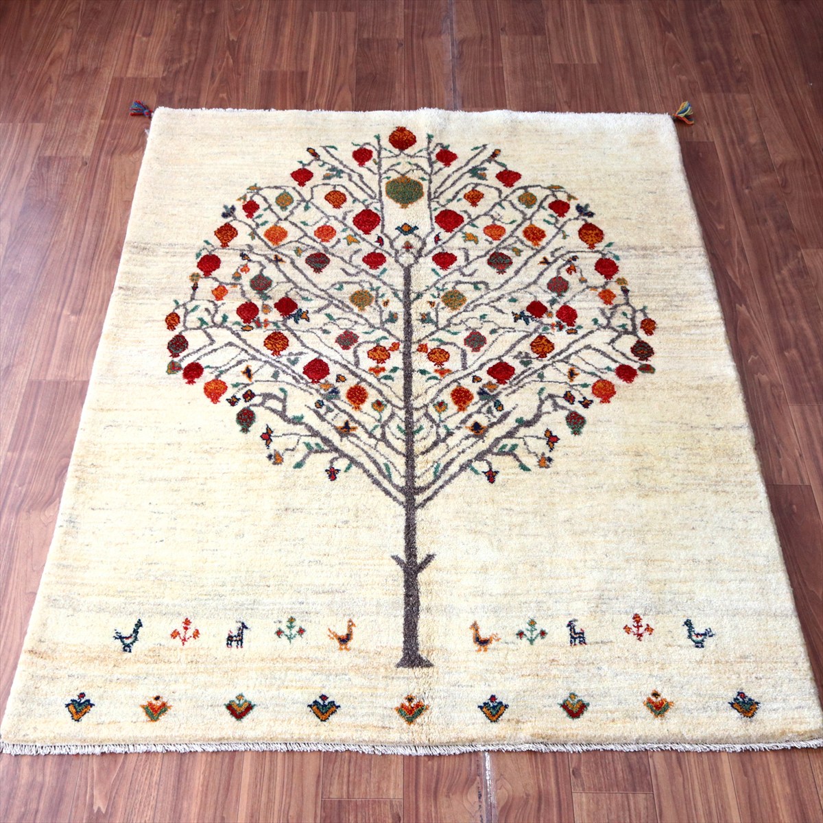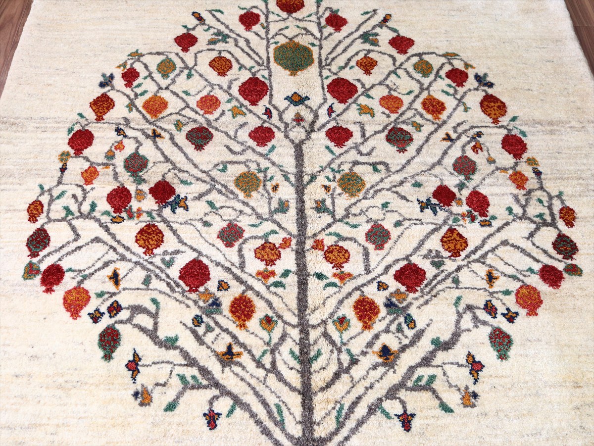 ギャッベ Gabbeh ナチュラルアイボリー 198×160cm イラン産 ザクロの樹と鳥と動物