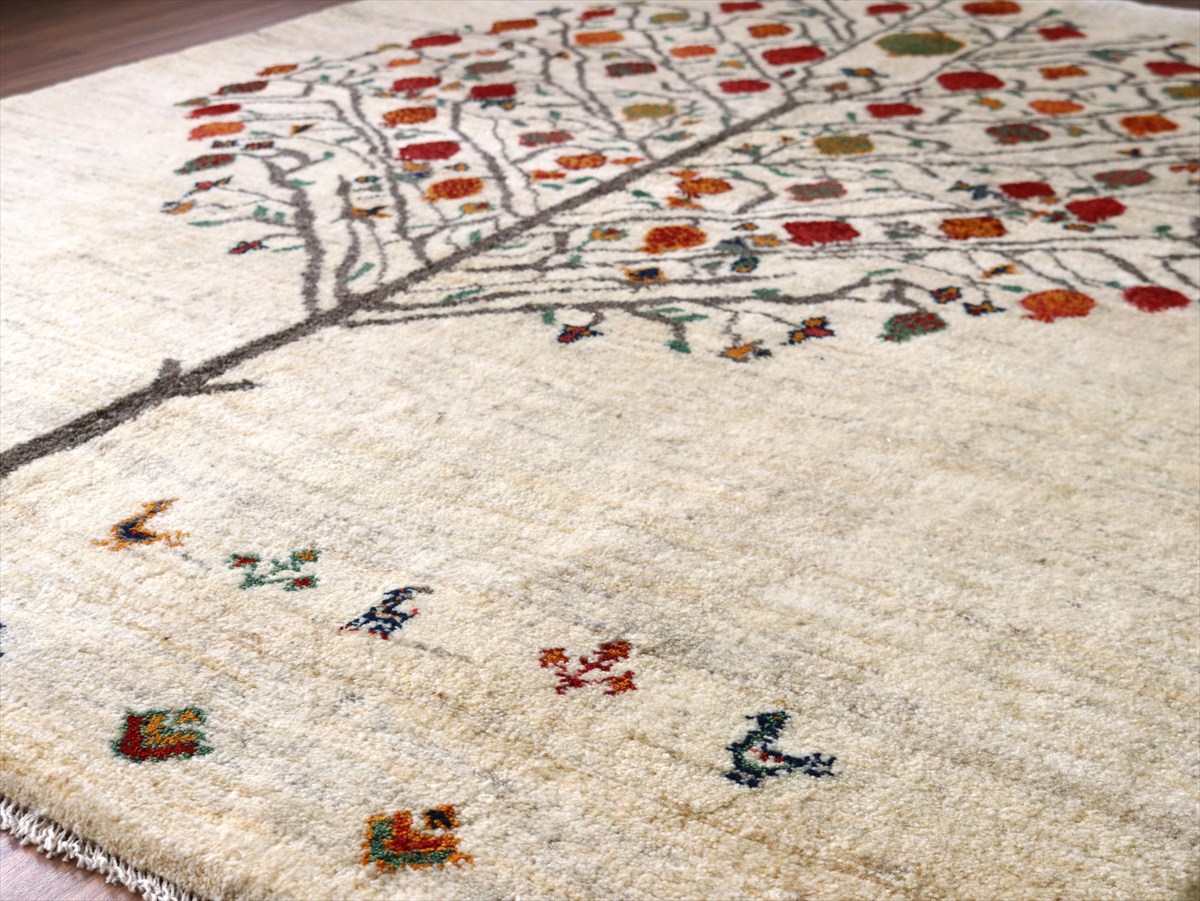 - ギャッベ Gabbeh ナチュラルアイボリー 198×160cm イラン産 ザクロの樹と鳥と動物