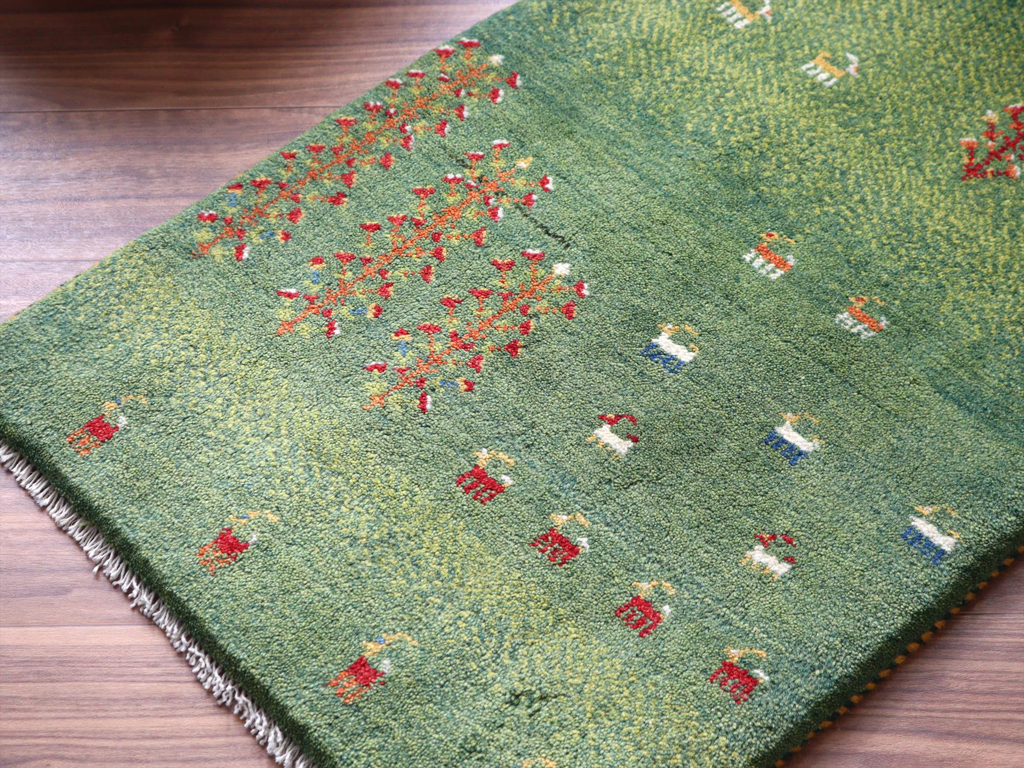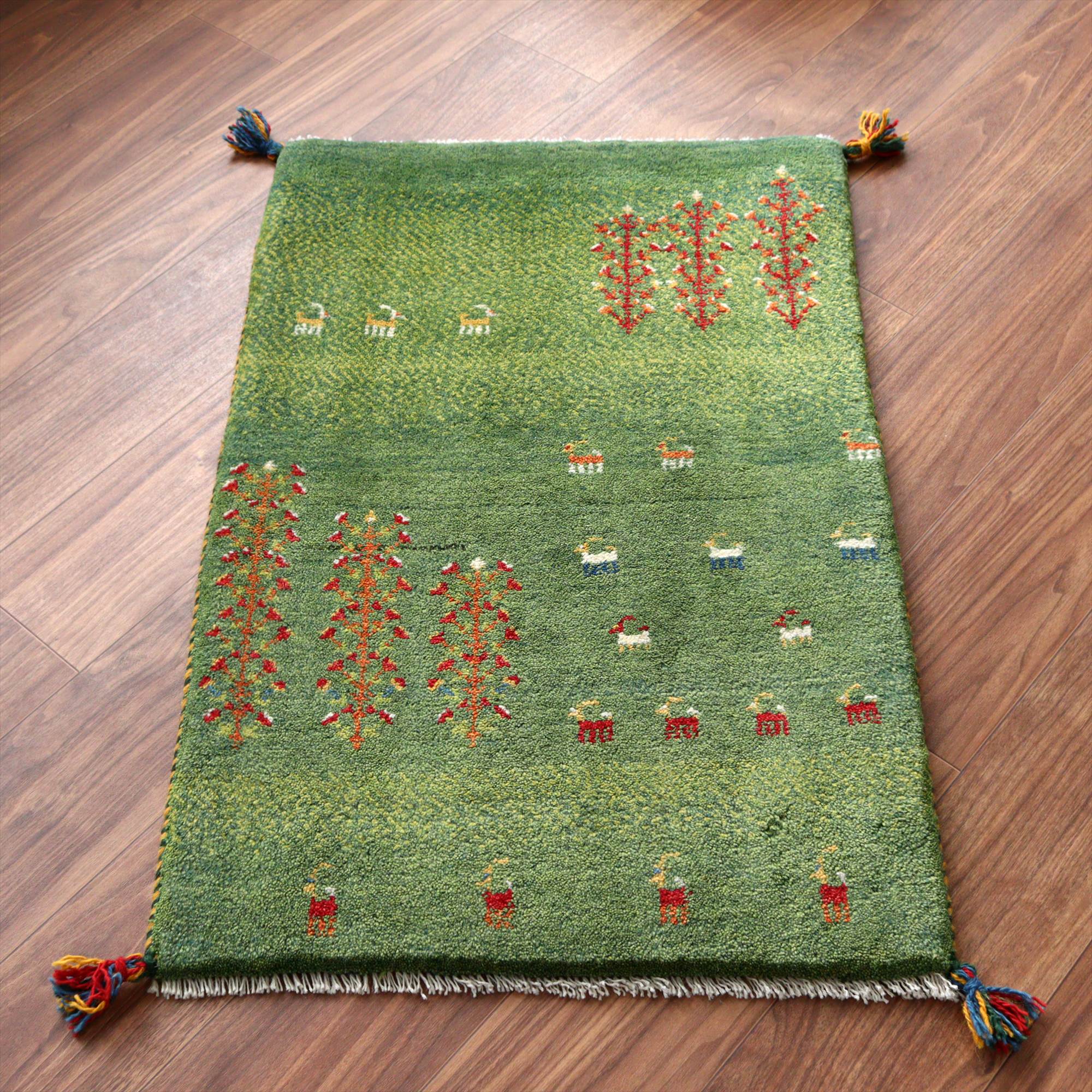 ギャッベ イラン産手織りラグ 93x60cm 生命の樹と動物 グリーン