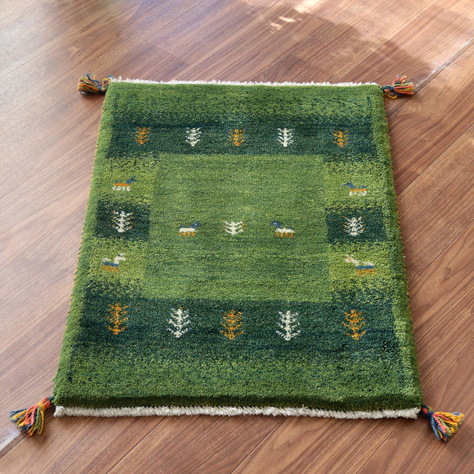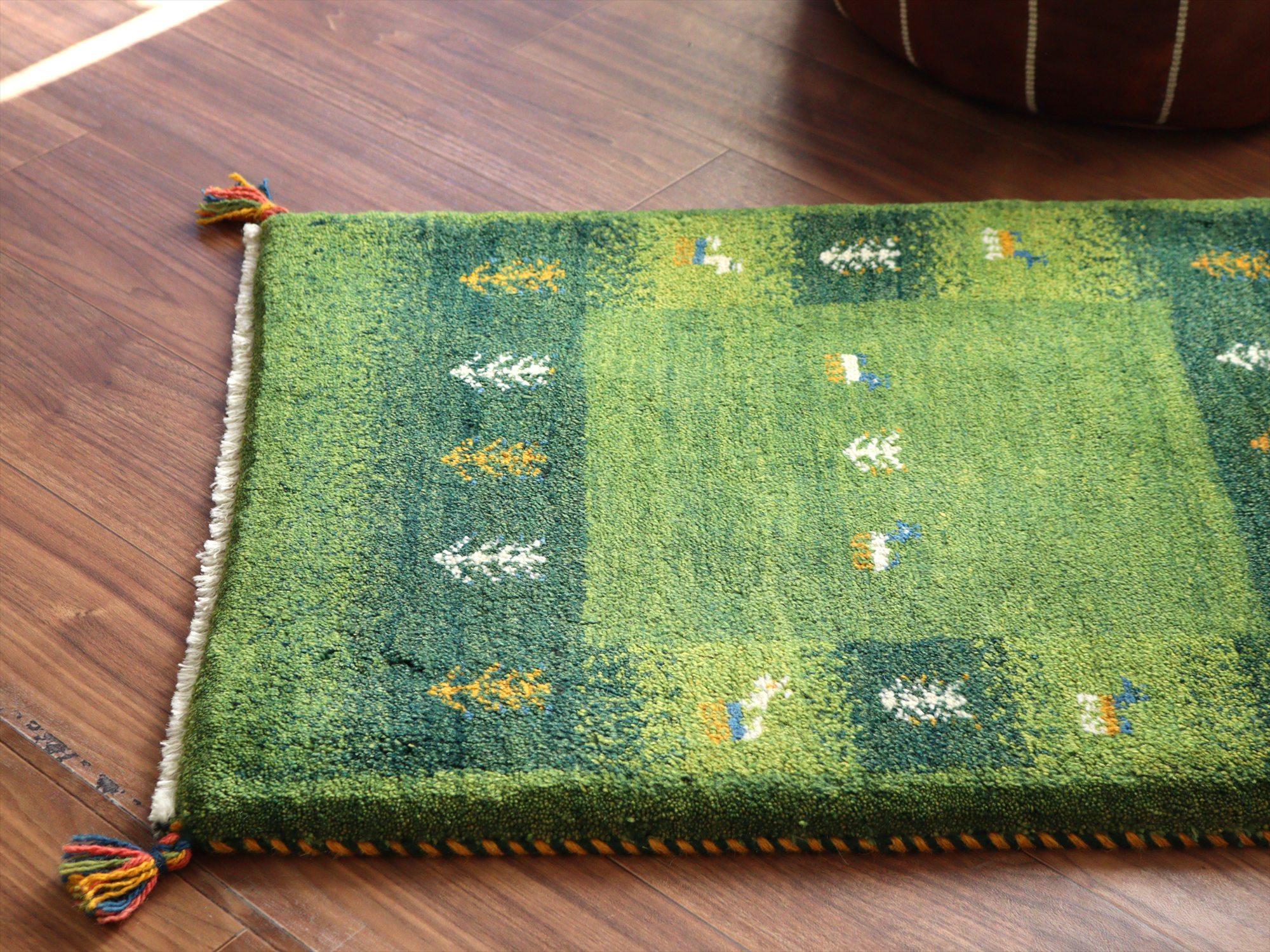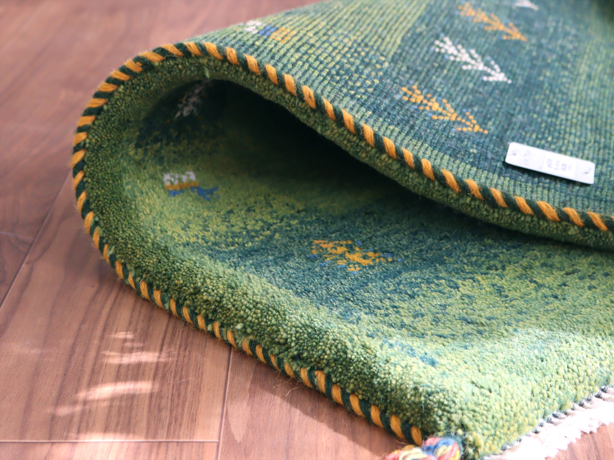 ギャッベ イラン産手織りラグ 88x63cm グリーン 動物と植物
