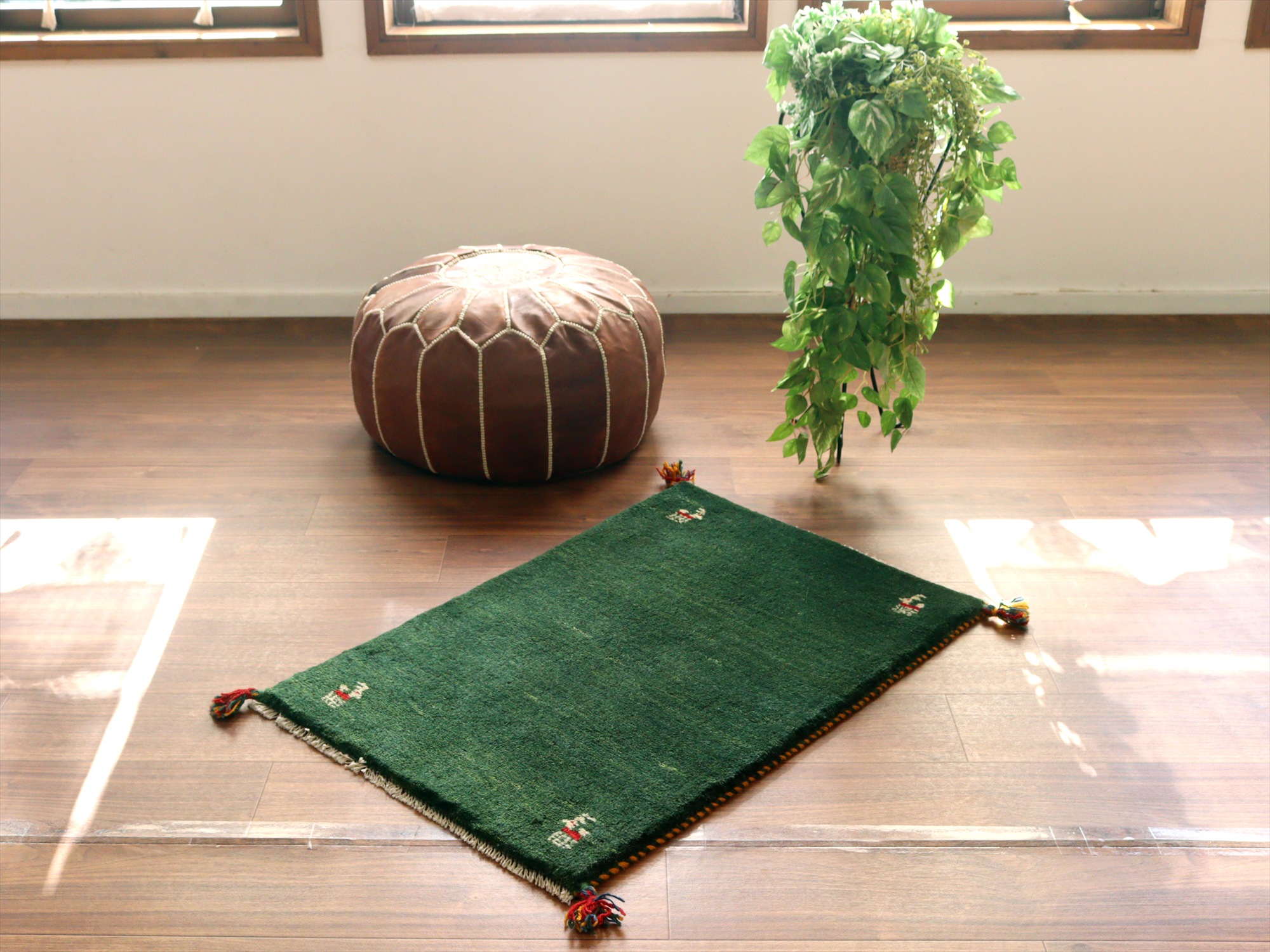 ギャッベ イラン産手織りラグ 88x60cm グリーン シンプルモチーフ