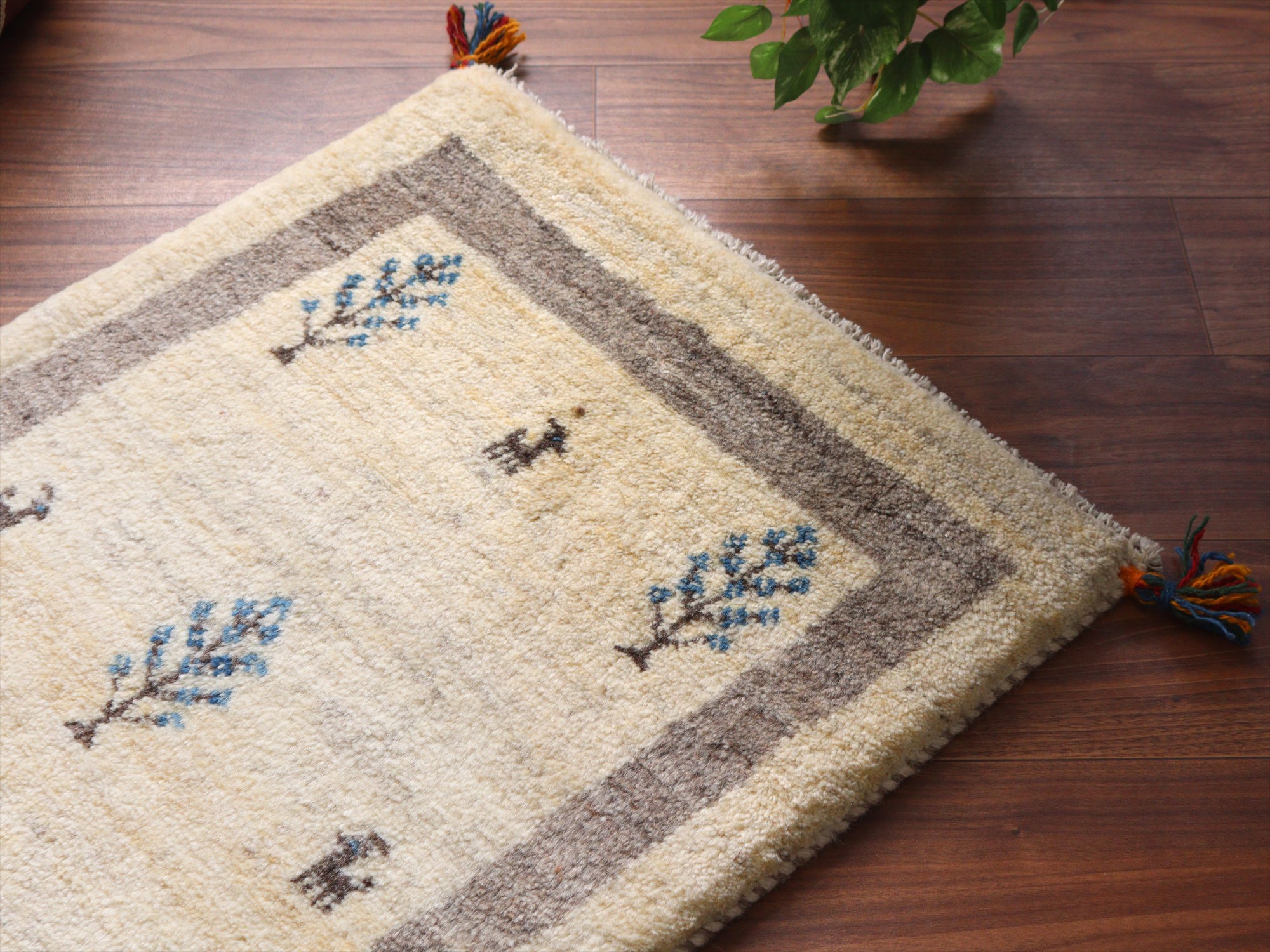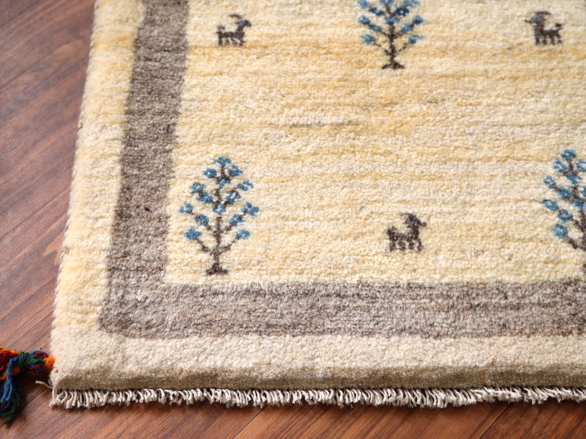 ギャッベ イラン産手織りラグ 90x62cm 植物と動物 アイボリー&グレー