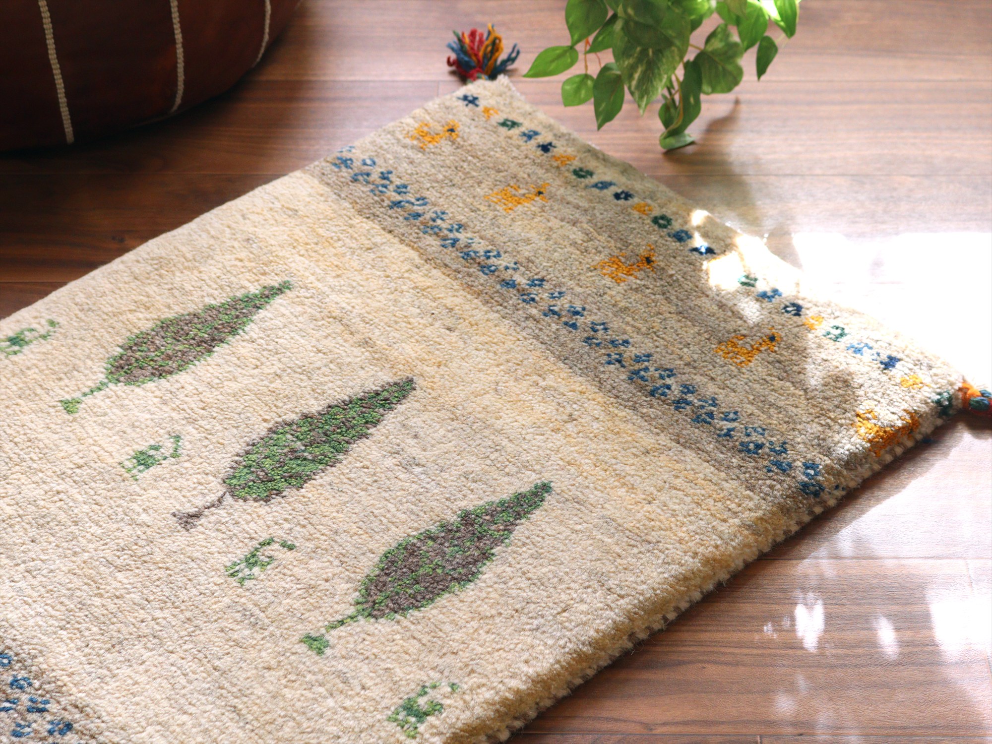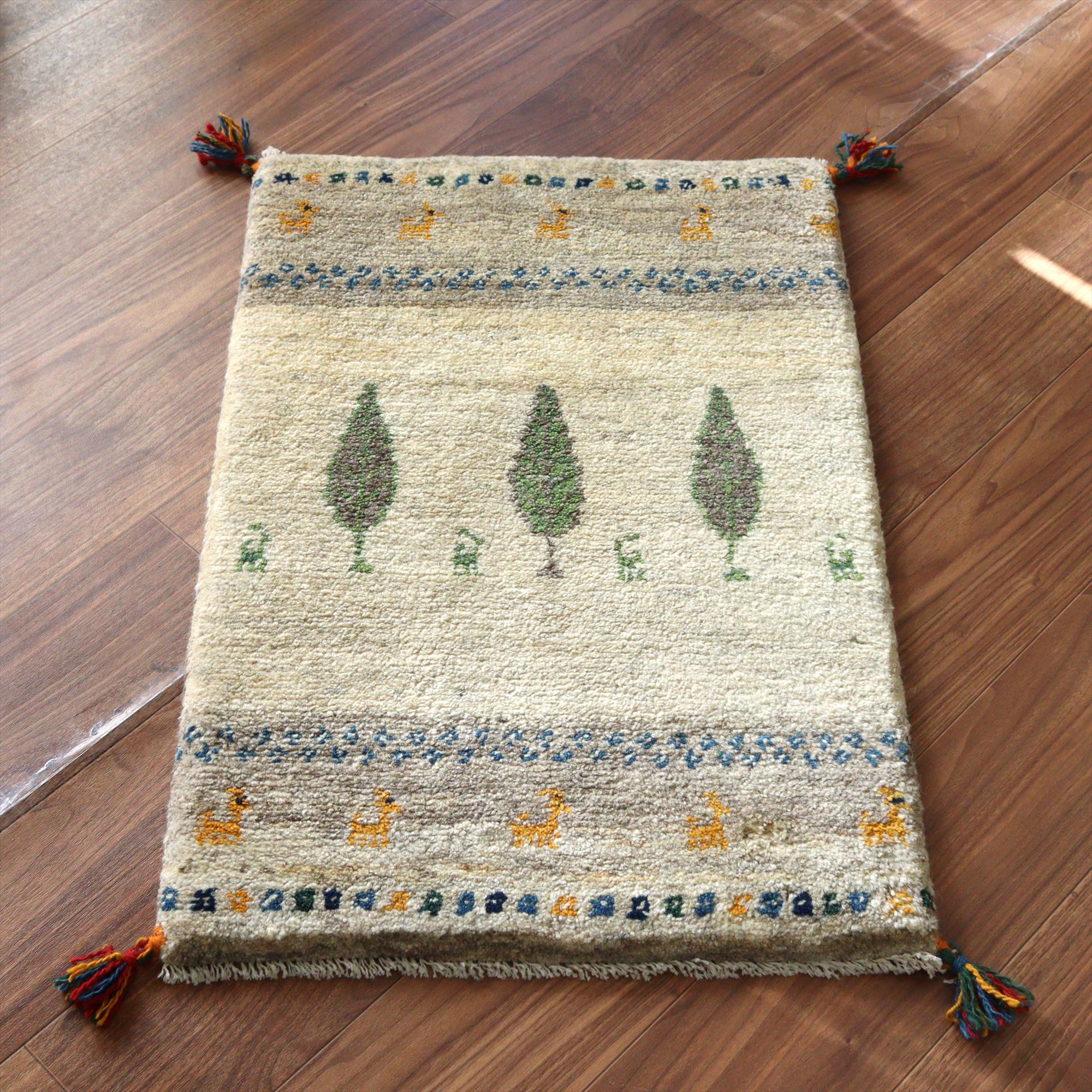 ギャッベ イラン産手織りラグ 88x58cm 動物と植物 アイボリー
