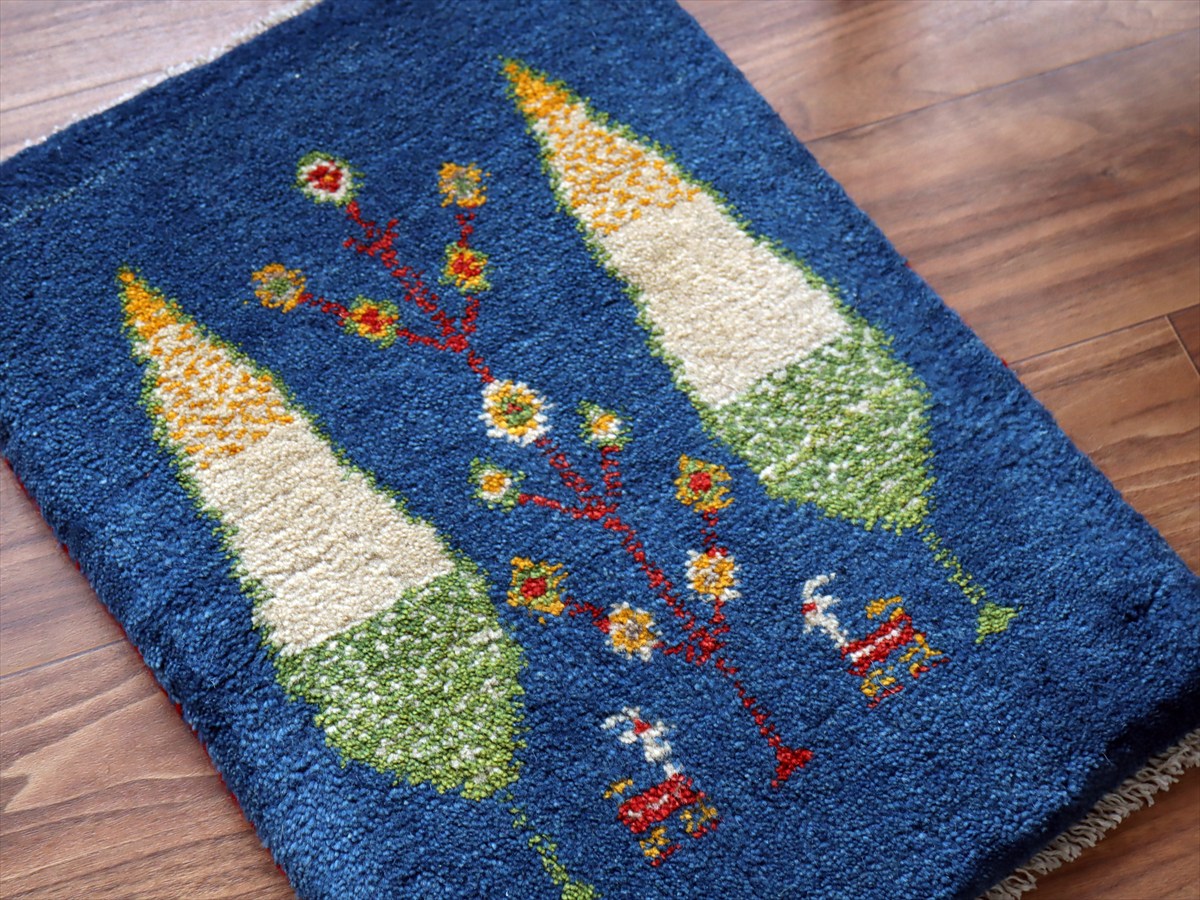 - ギャッベ ミニギャベ イラン産 55×40cm ブルー 糸杉と動物