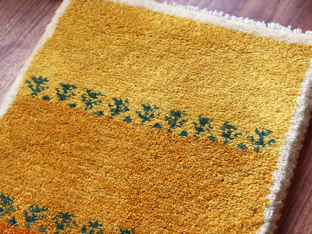 Key:ギャッベ,ギャベ,一点もの 現品販売 ラグ,ウール製,イラン,手織り,じゅうたん,絨毯,座布団, イエロー オレンジ 黄色 草木染, ガラタバザール Gabbeh, Handmade, Hand knotted, Tribal rug, Iran carpet, Wool, Natural Dye,