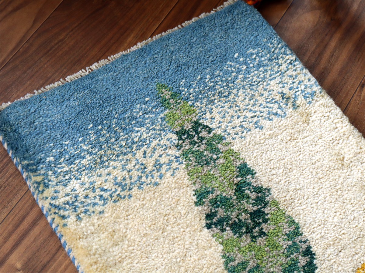 - ギャッベ ミニギャベ イラン産 56×42cm ナチュラルアイボリー&ブルー 糸杉と動物