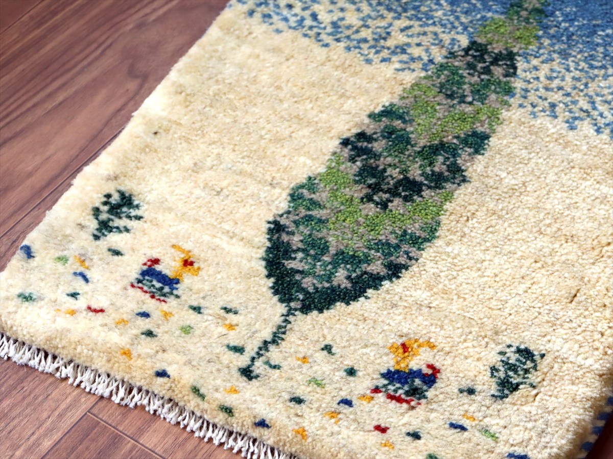 ギャッベ ミニギャベ イラン産 56×42cm ナチュラルアイボリー&ブルー 糸杉と動物